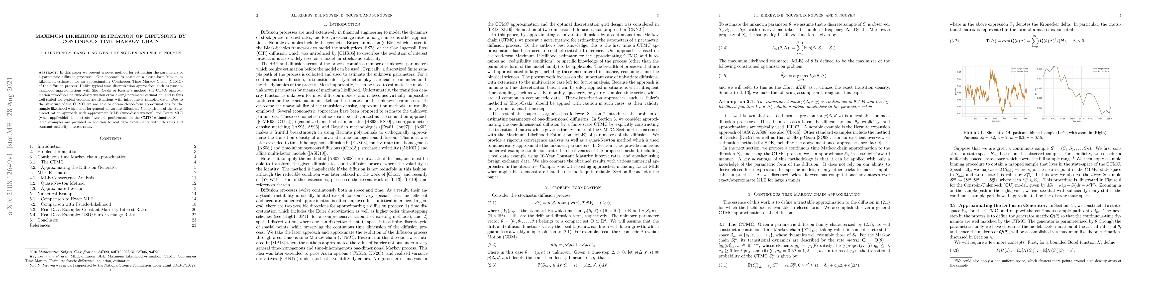 This paper introduces a novel Maximum Likelihood Estimation method for diffusion processes, using a Continuous Time Markov Chain (CTMC) approximation that avoids time-discretization errors. The CTMC approach provides closed-form likelihood approximations suitable for infrequent data sampling, and demonstrates favorable performance compared to traditional methods.