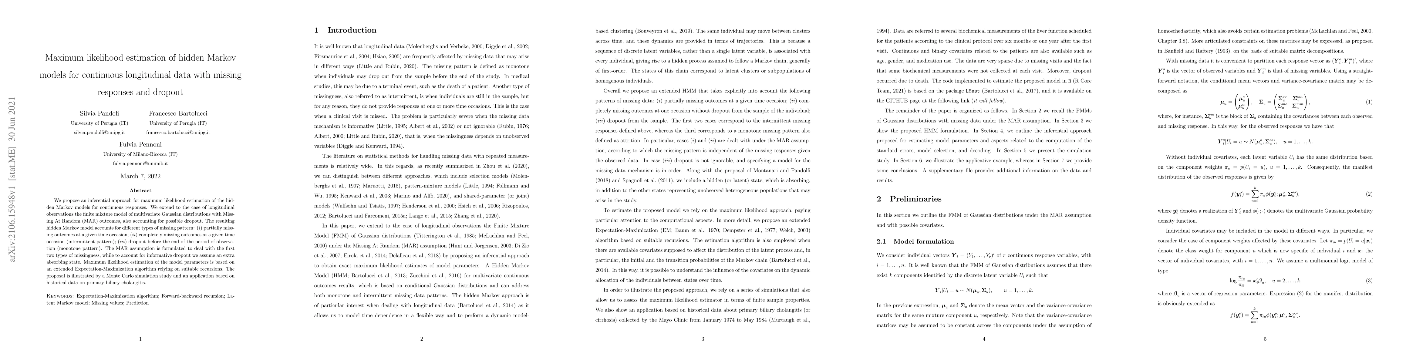 This paper proposes a maximum likelihood estimation method for hidden Markov models applied to continuous longitudinal data, addressing missing responses and dropout. It extends the finite mixture model of multivariate Gaussian distributions to handle MAR outcomes and various missing patterns, employing an extended Expectation-Maximization algorithm for parameter estimation.