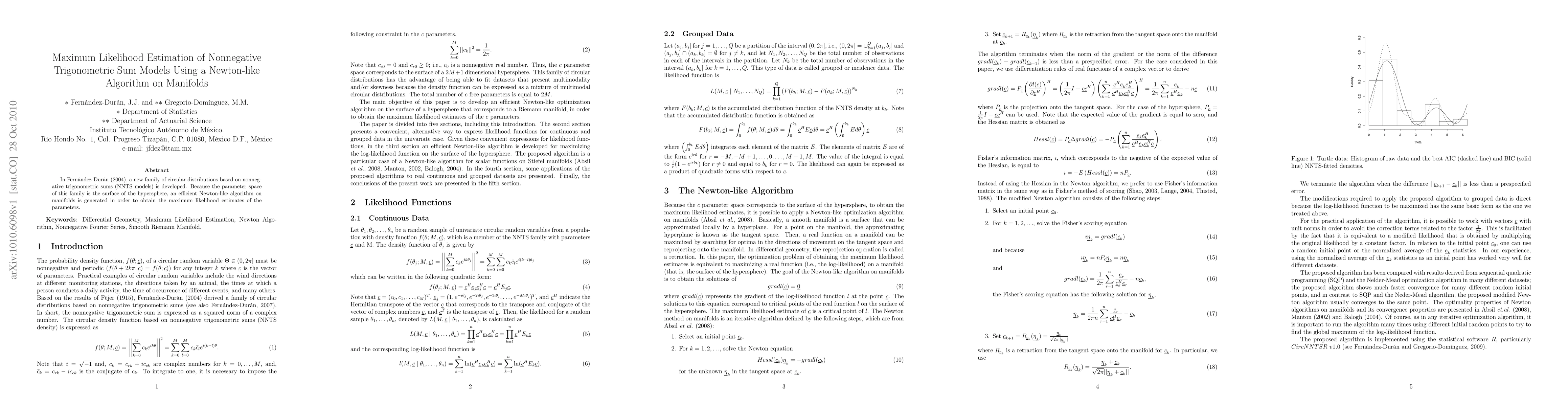 In Fern\'andez-Dur\'an (2004), a new family of circular distributions based on nonnegative trigonometric sums (NNTS models) is developed. Because the parameter space of this family is the surface of the hypersphere, an efficient Newton-like algorithm on manifolds is generated in order to obtain the maximum likelihood estimates of the parameters.
