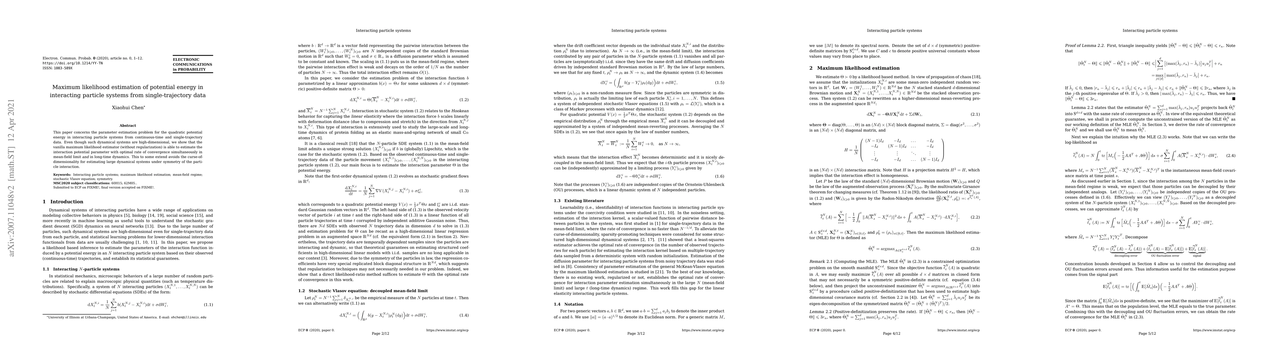 This paper demonstrates that the maximum likelihood estimator can estimate the quadratic potential energy in high-dimensional interacting particle systems from single-trajectory data with optimal convergence rates, effectively circumventing the curse of dimensionality under particle interaction symmetry.