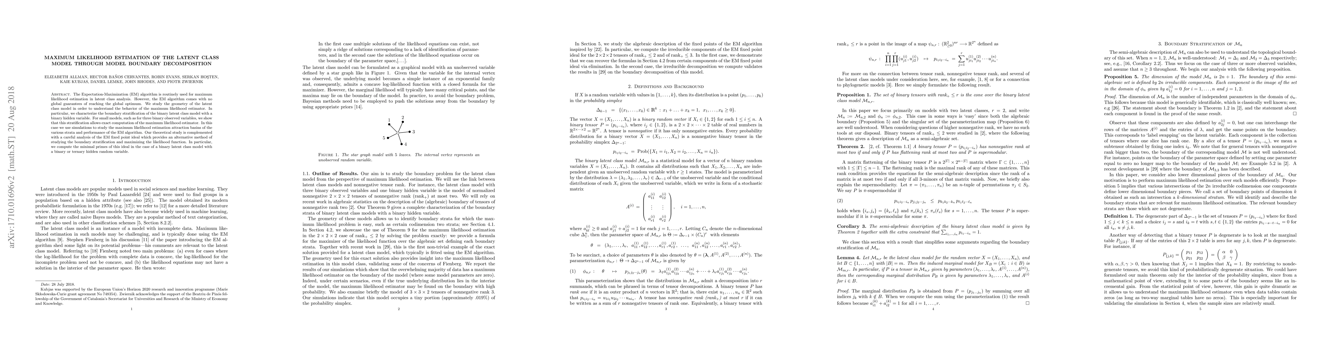 This paper explores the geometry of the latent class model to improve maximum likelihood estimation using the EM algorithm, focusing on boundary stratification for small models. It demonstrates exact computation of the maximum likelihood estimator through model boundary decomposition and analyzes attraction basins via simulations.