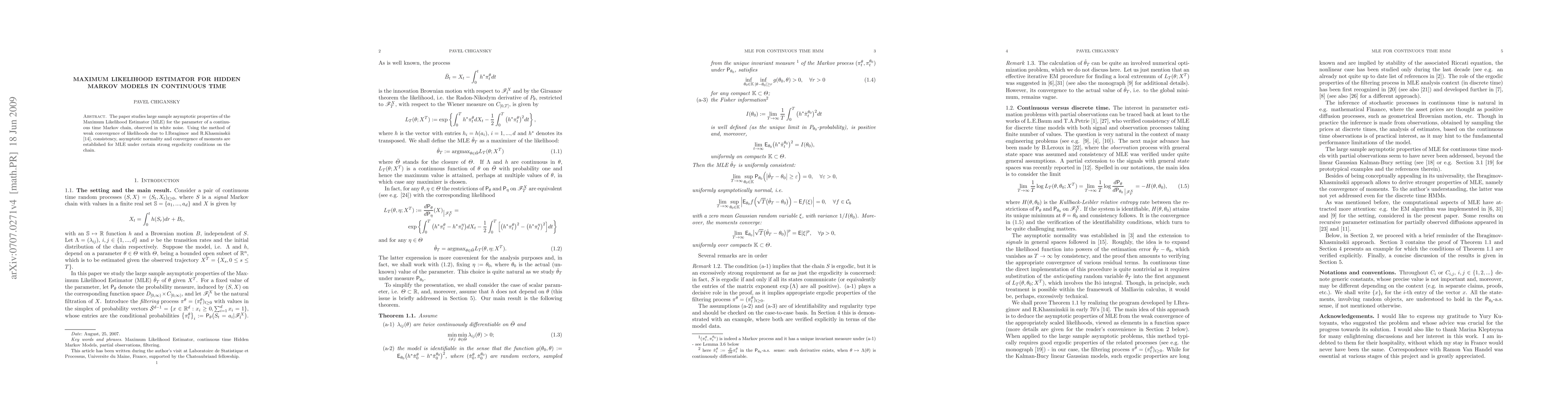 Summary: The paper examines the asymptotic properties of the Maximum Likelihood Estimator for continuous time Hidden Markov Models observed with white noise, proving its consistency, asymptotic normality, and moment convergence under strong ergodicity conditions.