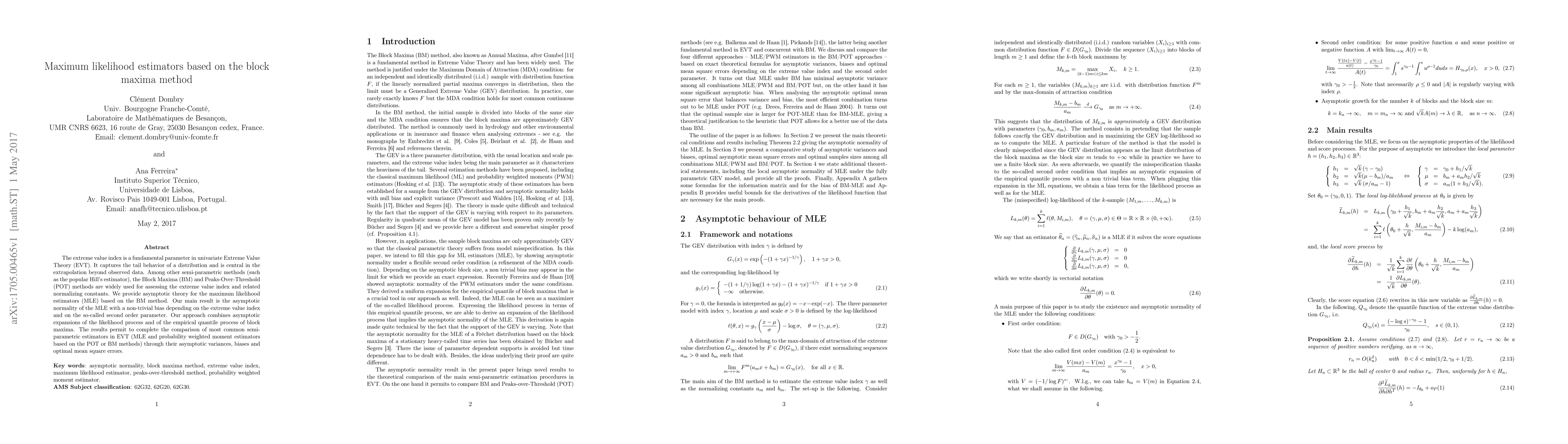 This paper develops asymptotic theory for maximum likelihood estimators (MLE) based on the Block Maxima (BM) method in Extreme Value Theory (EVT), proving their asymptotic normality and identifying a bias dependent on the extreme value index and a second order parameter. The study compares common semi-parametric estimators through their asymptotic variances, biases, and optimal mean square errors.