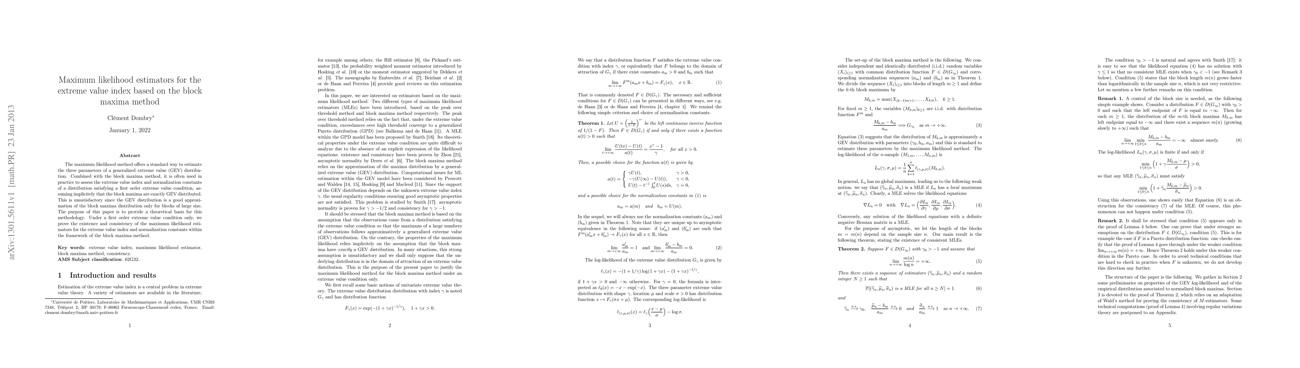 This paper establishes the theoretical foundation for maximum likelihood estimators of the extreme value index and normalization constants using the block maxima method, proving their existence and consistency under a first-order extreme value condition, despite the GEV distribution being a good approximation only for large block sizes.