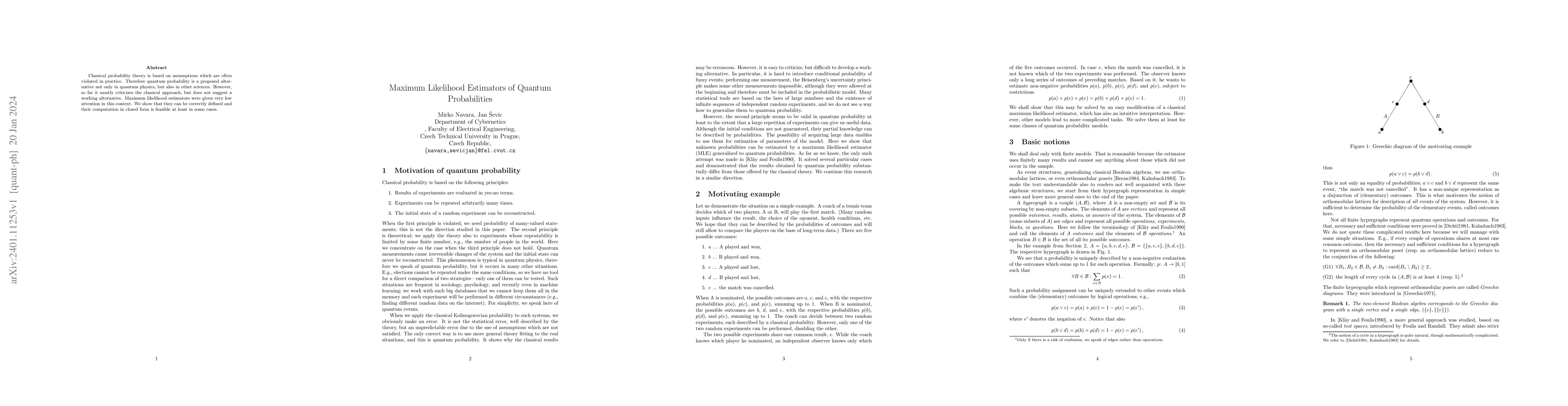 This paper proposes maximum likelihood estimators for quantum probabilities, demonstrating their feasibility in closed form computation in certain scenarios, offering a practical alternative to classical probability theory.