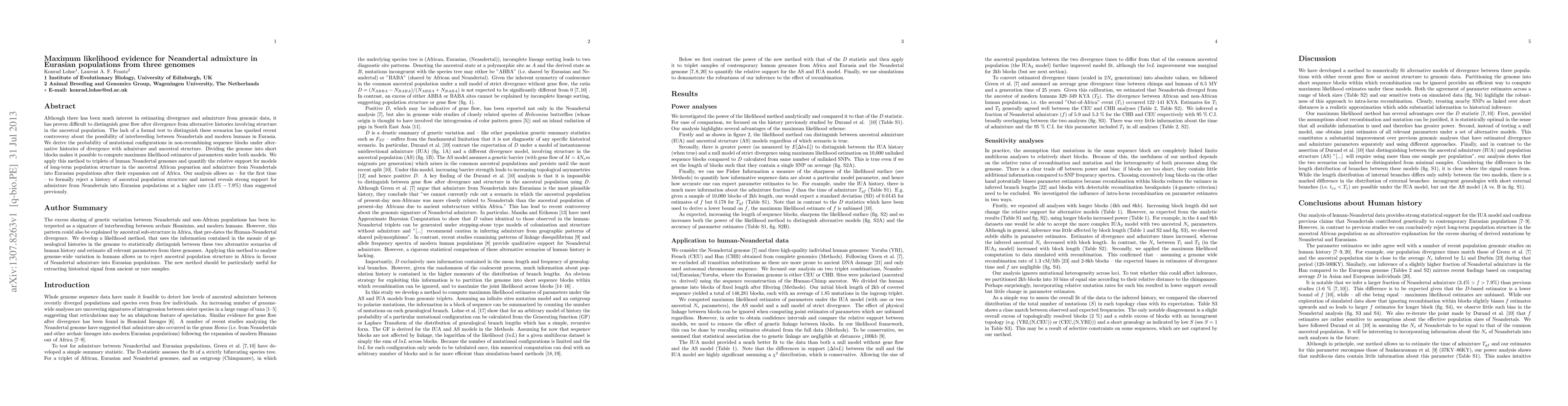 This research provides strong maximum likelihood evidence for Neandertal admixture in Eurasian populations, formally rejecting long-term ancestral population structure in favor of interbreeding with Neandertals at a higher rate (3.4%-7.9%). The study uses a novel method dividing genomes into short blocks to compute estimates under different evolutionary models.