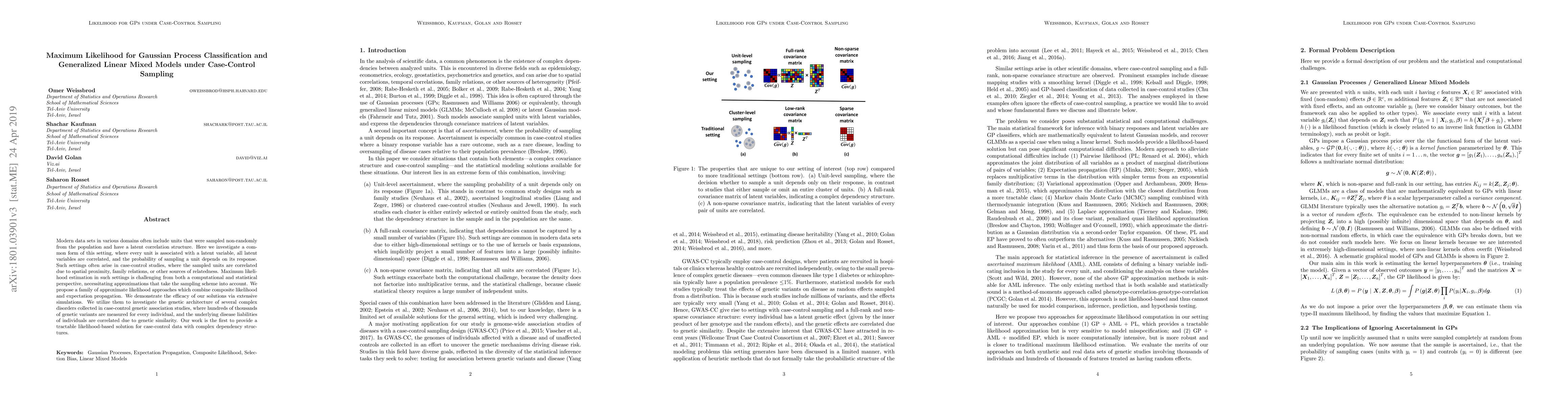 This paper proposes approximate likelihood methods for Gaussian Process Classification and Generalized Linear Mixed Models under case-control sampling, addressing the challenges of non-random sampling and latent correlations. The proposed composite likelihood and expectation propagation techniques are validated through simulations and applied to genetic association studies.