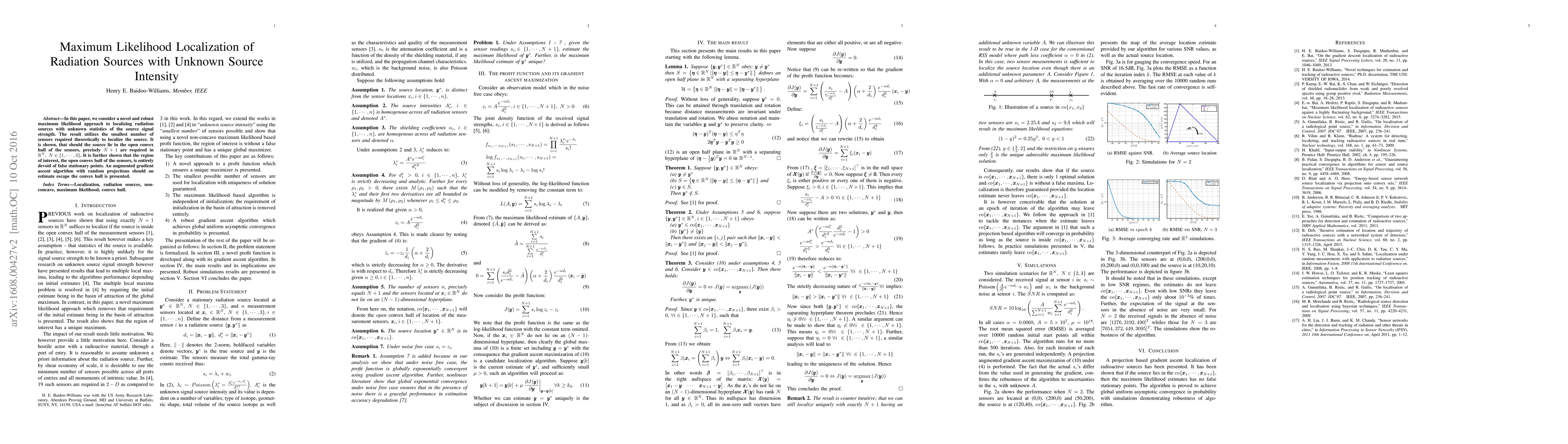 This research introduces a novel maximum likelihood method to locate radiation sources with uncertain signal strengths, requiring a theoretical minimum of N+1 sensors in N-dimensional space for N up to 3. The algorithm ensures no false stationary points in the convex hull of sensors and includes a random projection gradient ascent technique for estimates outside the hull.