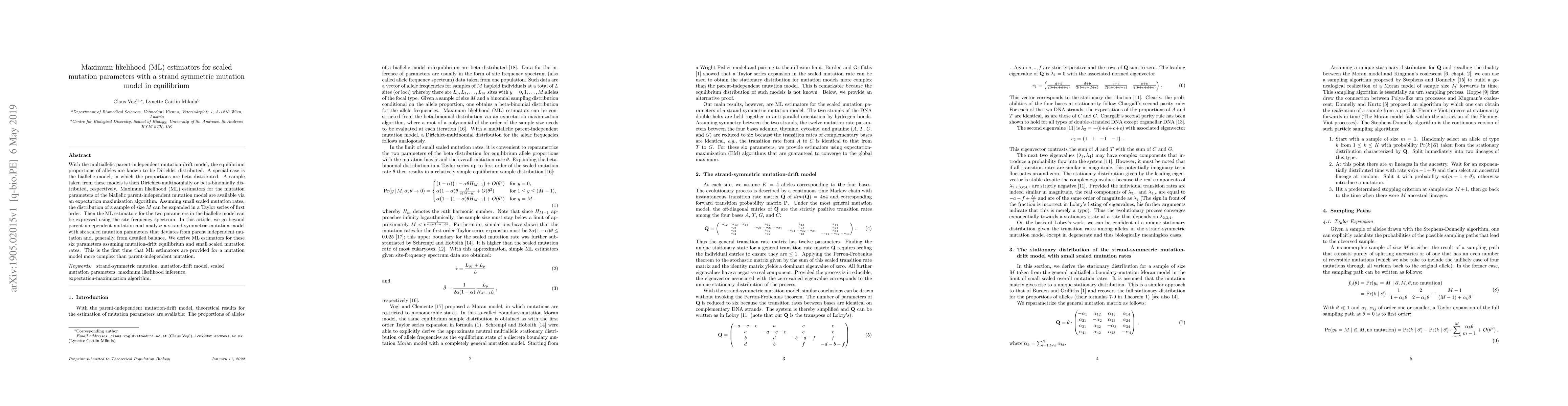 This paper develops maximum likelihood (ML) estimators for six scaled mutation parameters in a strand-symmetric mutation model, extending beyond the parent-independent mutation model. It provides the first ML estimators for a more complex mutation model, assuming mutation-drift equilibrium and small scaled mutation rates.