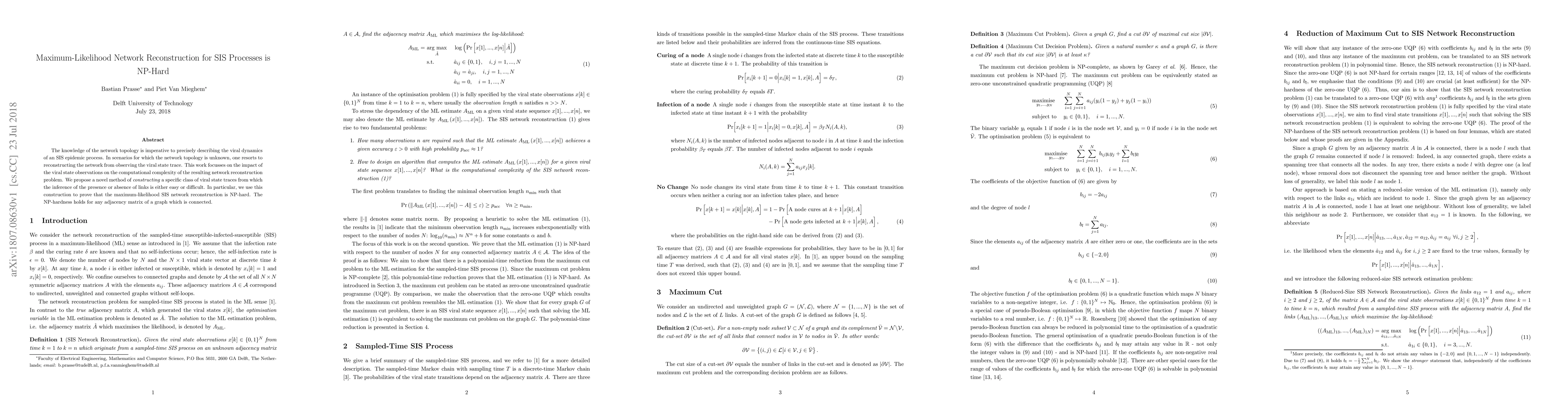 The knowledge of the network topology is imperative to precisely describing the viral dynamics of an SIS epidemic process. In scenarios for which the network topology is unknown, one resorts to reconstructing the network from observing the viral state trace. This work focusses on the impact of the viral state observations on the computational complexity of the resulting network reconstruction problem. We propose a novel method of constructing a specific class of viral state traces from which the inference of the presence or absence of links is either easy or difficult. In particular, we use this construction to prove that the maximum-likelihood SIS network reconstruction is NP-hard. The NP-hardness holds for any adjacency matrix of a graph which is connected.