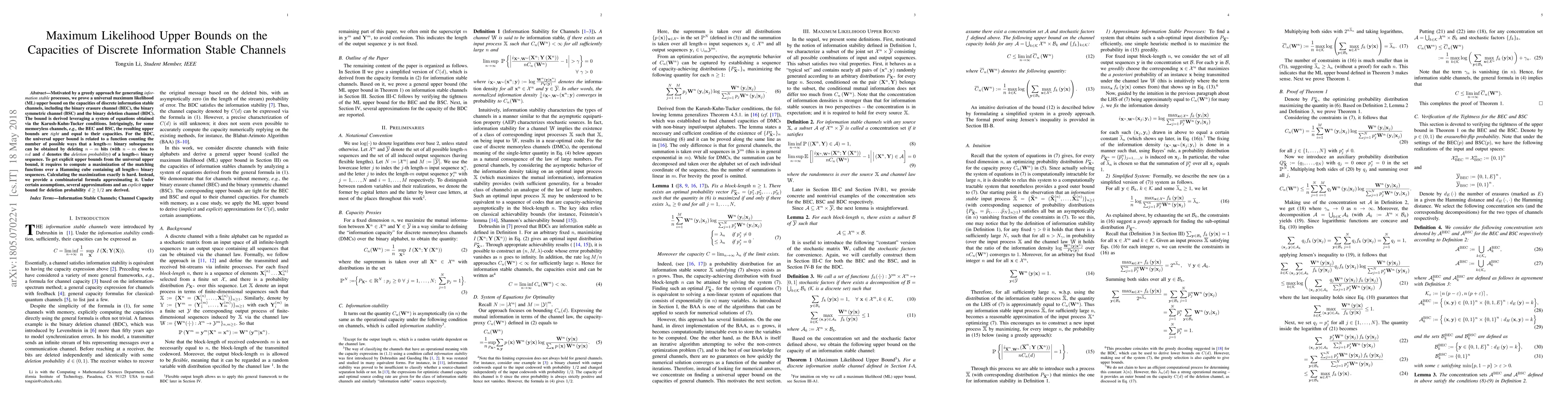 Motivated by a greedy approach for generating {\it{information stable}} processes, we prove a universal maximum likelihood (ML) upper bound on the capacities of discrete information stable channels, including the binary erasure channel (BEC), the binary symmetric channel (BSC) and the binary deletion channel (BDC). The bound is derived leveraging a system of equations obtained via the Karush-Kuhn-Tucker conditions. Intriguingly, for some memoryless channels, e.g., the BEC and BSC, the resulting upper bounds are tight and equal to their capacities. For the BDC, the universal upper bound is related to a function counting the number of possible ways that a length-$\lo$ binary subsequence can be obtained by deleting $n-m$ bits (with $n-m$ close to $nd$ and $d$ denotes the {\it{deletion probability}}) of a length-$n$ binary sequence. To get explicit upper bounds from the universal upper bound, it requires to compute a maximization of the matching functions over a Hamming cube containing all length-$n$ binary sequences. Calculating the maximization exactly is hard. Instead, we provide a combinatorial formula approximating it. Under certain assumptions, several approximations and an {\it{explicit}} upper bound for deletion probability $d\geq 1/2$ are derived.