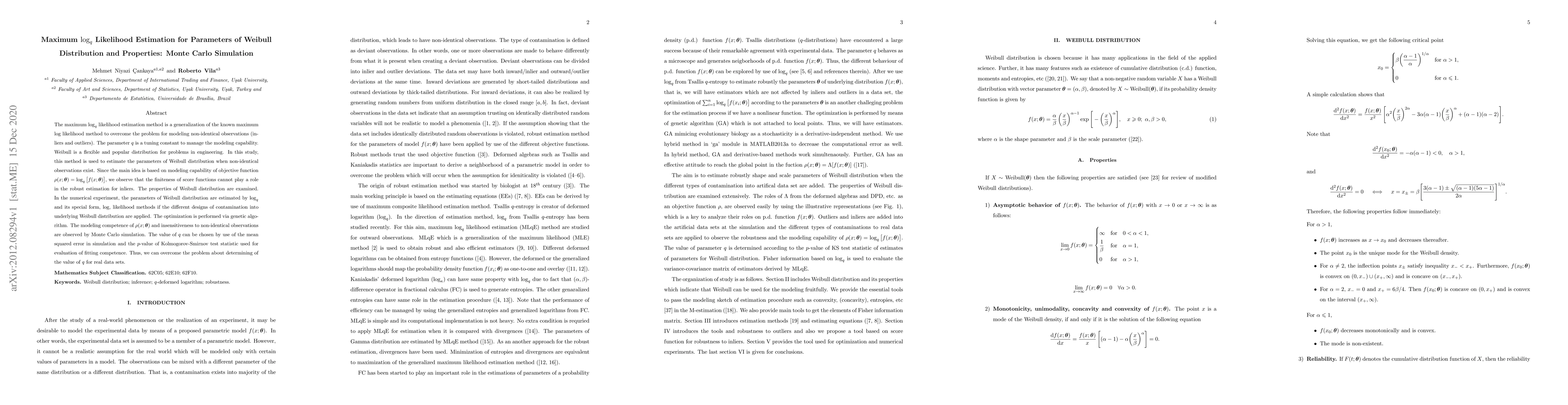 This paper proposes a maximum $\log_q$ likelihood estimation method to robustly estimate Weibull distribution parameters in the presence of non-identical observations, using a genetic algorithm for optimization. The method's performance is evaluated via Monte Carlo simulation, demonstrating its modeling competence and insensitivity to outliers.