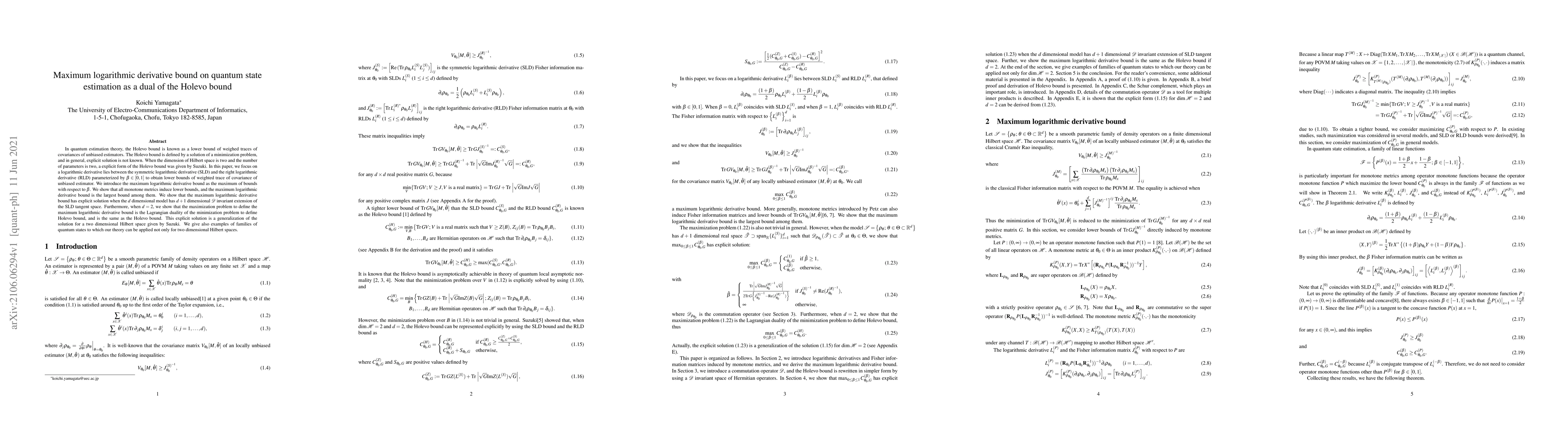 This paper explores the maximum logarithmic derivative bound in quantum state estimation, showing it is the largest bound among monotone metrics. It demonstrates that for $d=2$, this bound is equivalent to the Holevo bound, generalizing the explicit solution given by Suzuki for two-dimensional Hilbert spaces.