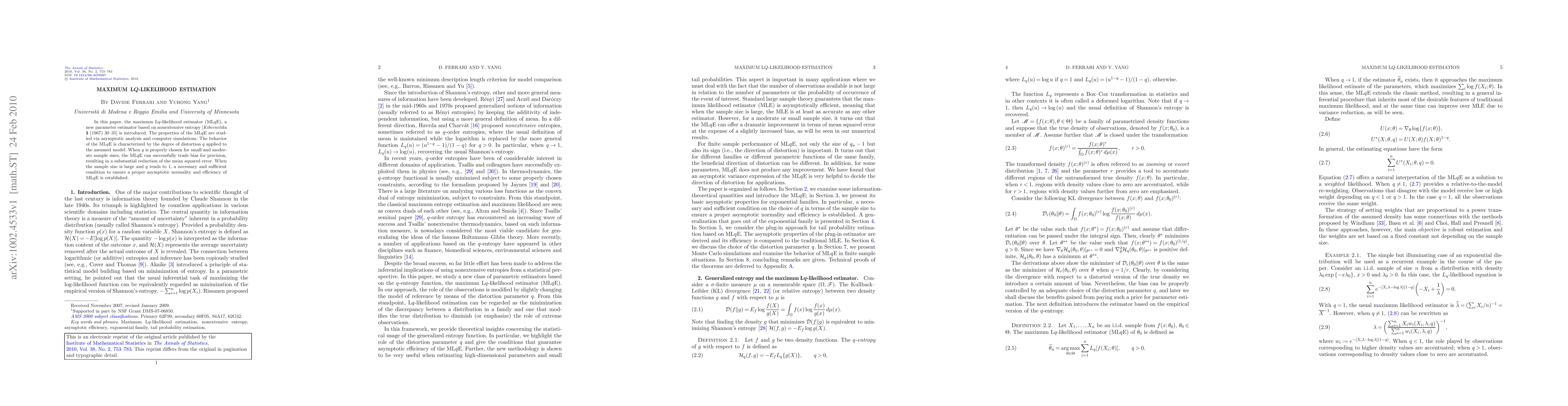 In this paper, the maximum L$q$-likelihood estimator (ML$q$E), a new parameter estimator based on nonextensive entropy [Kibernetika 3 (1967) 30--35] is introduced. The properties of the ML$q$E are studied via asymptotic analysis and computer simulations. The behavior of the ML$q$E is characterized by the degree of distortion $q$ applied to the assumed model. When $q$ is properly chosen for small and moderate sample sizes, the ML$q$E can successfully trade bias for precision, resulting in a substantial reduction of the mean squared error. When the sample size is large and $q$ tends to 1, a necessary and sufficient condition to ensure a proper asymptotic normality and efficiency of ML$q$E is established.