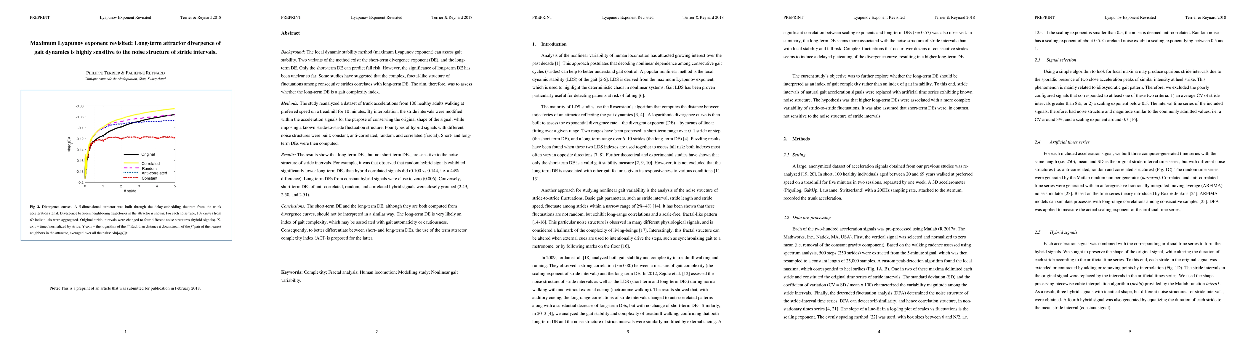 The local dynamic stability method (maximum Lyapunov exponent) can assess gait stability. Two variants of the method exist: the short-term divergence exponent (DE), and the long-term DE. Only the short-term DE can predict fall risk. The significance of long-term DE has been unclear so far. Some studies have suggested that the complex, fractal-like structure of fluctuations among consecutive strides correlates with long-term DE. The aim, therefore, was to assess whether the long-term DE is a gait complexity index. The study reanalyzed a dataset of trunk accelerations from 100 healthy adults walking at preferred speed on a treadmill for 10 minutes. By interpolation, the stride intervals were modified within the acceleration signals for the purpose of conserving the original shape of the signal, while imposing a known stride-to-stride fluctuation structure. 4 types of hybrid signals with different noise structures were built: constant, anti-correlated, random, and correlated (fractal). Short- and long-term DEs were then computed. The results show that long-term DEs, but not short-term DEs, are sensitive to the noise structure of stride intervals. It was that observed that random hybrid signals exhibited significantly lower long-term DEs than hybrid correlated signals did (0.100 vs 0.144, i.e. a 44% difference). Long-term DEs from constant hybrid signals were close to zero (0.006). Short-term DEs of anti-correlated, random, and correlated hybrid signals were closely grouped (2.49, 2.50, and 2.51). The short- and long-term DEs, although they are both computed from divergence curves, should not be interpreted in a similar way. The long-term DE is very likely an index of gait complexity, which may be associated with gait automaticity or cautiousness. To better differentiate between short- and long-term DEs, the use of the term attractor complexity index (ACI) is proposed for the latter.