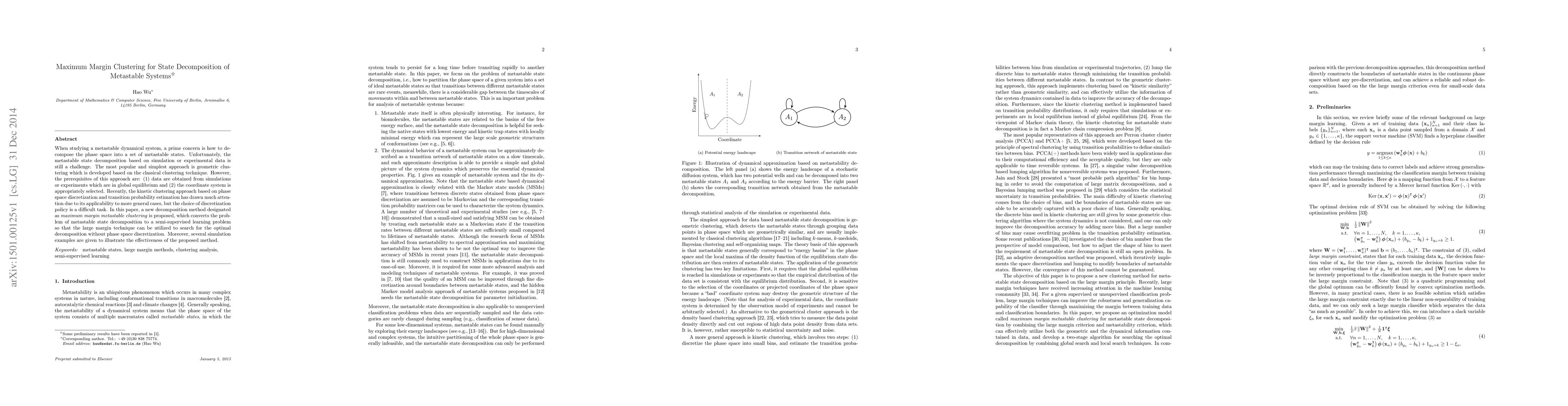 When studying a metastable dynamical system, a prime concern is how to decompose the phase space into a set of metastable states. Unfortunately, the metastable state decomposition based on simulation or experimental data is still a challenge. The most popular and simplest approach is geometric clustering which is developed based on the classical clustering technique. However, the prerequisites of this approach are: (1) data are obtained from simulations or experiments which are in global equilibrium and (2) the coordinate system is appropriately selected. Recently, the kinetic clustering approach based on phase space discretization and transition probability estimation has drawn much attention due to its applicability to more general cases, but the choice of discretization policy is a difficult task. In this paper, a new decomposition method designated as maximum margin metastable clustering is proposed, which converts the problem of metastable state decomposition to a semi-supervised learning problem so that the large margin technique can be utilized to search for the optimal decomposition without phase space discretization. Moreover, several simulation examples are given to illustrate the effectiveness of the proposed method.