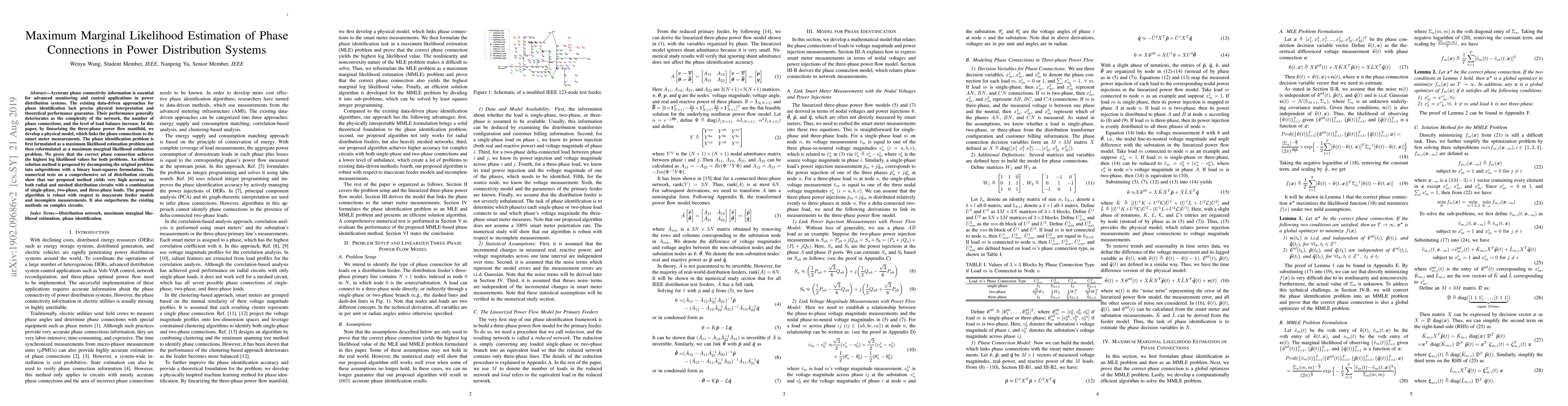 This paper develops a maximum marginal likelihood estimation method to accurately identify phase connections in power distribution systems, leveraging a linearized three-phase power flow model linked to smart meter data. The proposed method achieves high accuracy and robustness, outperforming existing techniques, especially in complex circuits.