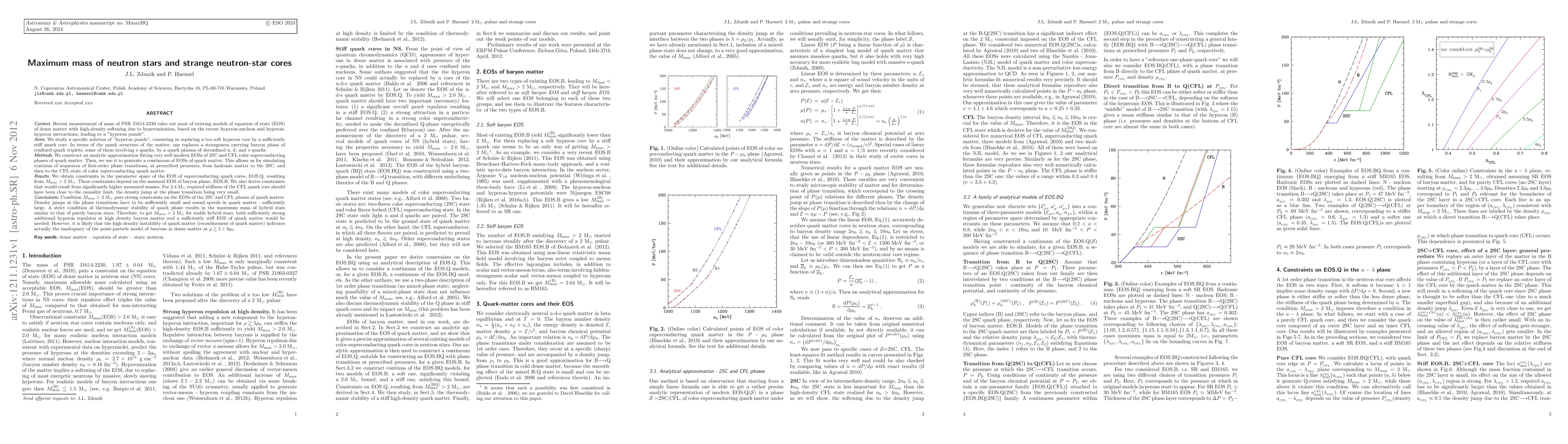 Recent measurement of mass of PSR J1614-2230 rules out most of existing models of equation of state (EOS) of dense matter with high-density softening due to hyperonization, based on the recent hyperon-nucleon and hyperon-hyperon interactions, leading to a "hyperon puzzle". We study a specific solution of "hyperon puzzle", consisting in replacing a too soft hyperon core by a sufficiently stiff quark core. We construct an analytic approximation fitting very well modern EOSs of 2SC and CFL color superconducting phases of quark matter. This allows us for simulating continua of sequences of first-order phase transitions from hadronic matter to the 2SC, and then to the CFL state of color superconducting quark matter. We obtain constraints in the parameter space of the EOS of superconducting quark cores, resulting from M_max> 2 M_sol. We also derive constraints that would result from significantly higher measured masses. For 2.4 M_sol required stiffness of the CFL quark core should have been close to the causality limit, the density jump at the phase transition being very small. Condition M_max > 2 M_sol puts strong constraints on the EOSs of the 2SC and CFL phases of quark matter. Density jumps at the phase transitions have to be sufficiently small and sound speeds in quark matter - sufficiently large. A strict condition of thermodynamic stability of quark phase results in the maximum mass of hybrid stars similar to that of purely baryon stars. Therefore, to get M_max>2 M_sol for stable hybrid stars, both sufficiently strong additional hyperon repulsion at high density baryon matter and a sufficiently stiff EOS of quark matter would be needed. However, it is likely that the high density instability of quark matter (reconfinement) indicates actually the inadequacy of the point-particle model of baryons in dense matter at very high densities.