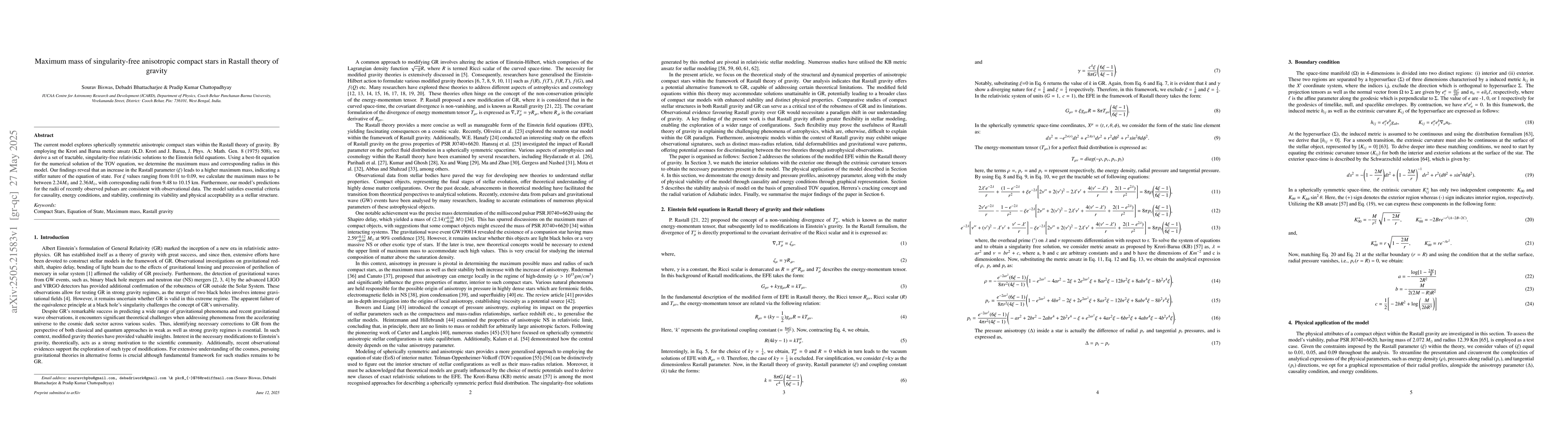 The derivation of tractable, singularity-free relativistic solutions in Rastall gravity for anisotropic compact stars and the determination of maximum mass and radius using a best-fit TOV equation solution.