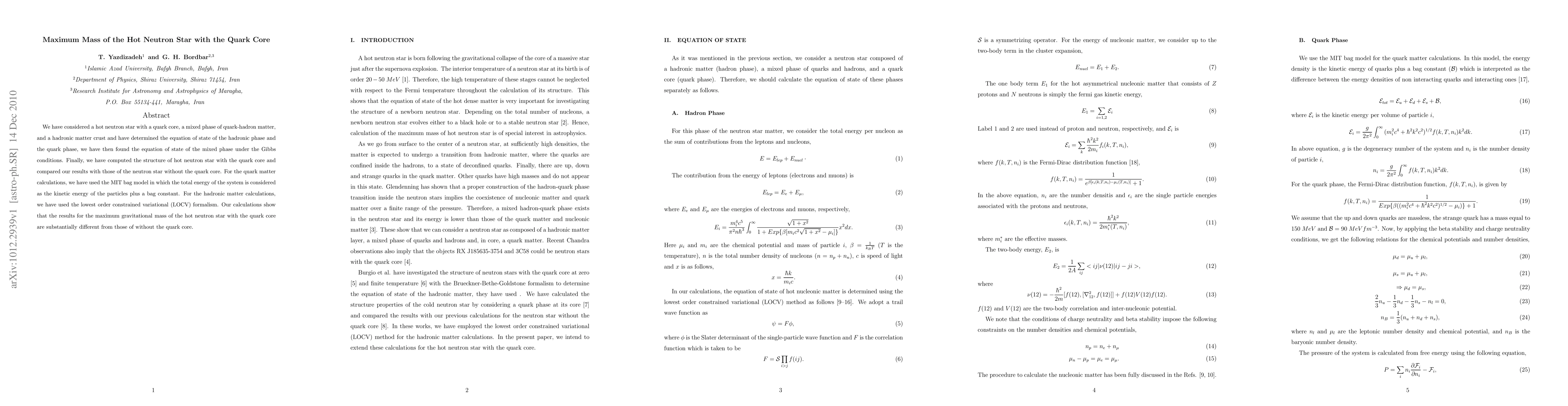 This paper explores the maximum mass of hot neutron stars containing quark cores, using the MIT bag model for quark matter and LOCV formalism for hadronic matter. The study finds that the presence of a quark core significantly alters the maximum gravitational mass compared to neutron stars without such cores.