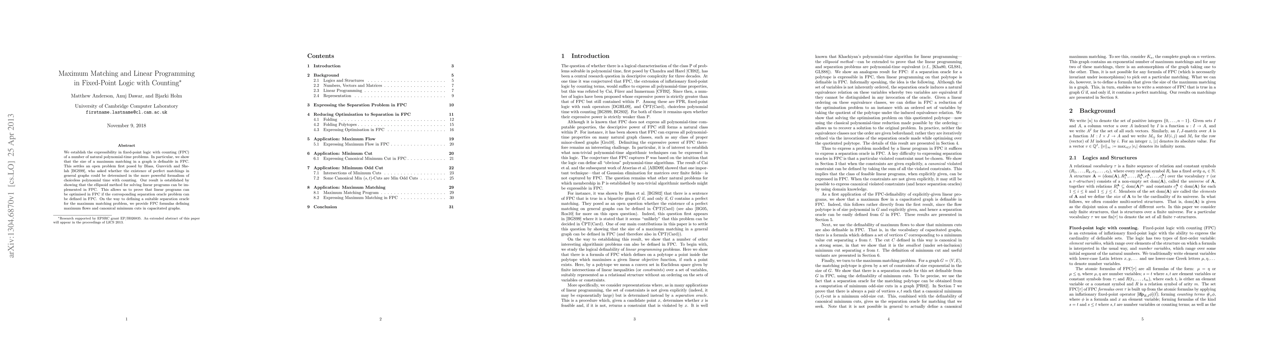 This paper demonstrates that maximum matching size in graphs is expressible in fixed-point logic with counting (FPC), resolving an open question posed by Blass, Gurevich, and Shelah. It achieves this by showing that the ellipsoid method for linear programming can be implemented in FPC, enabling the optimization of linear programs solvable via separation oracles defined in FPC.