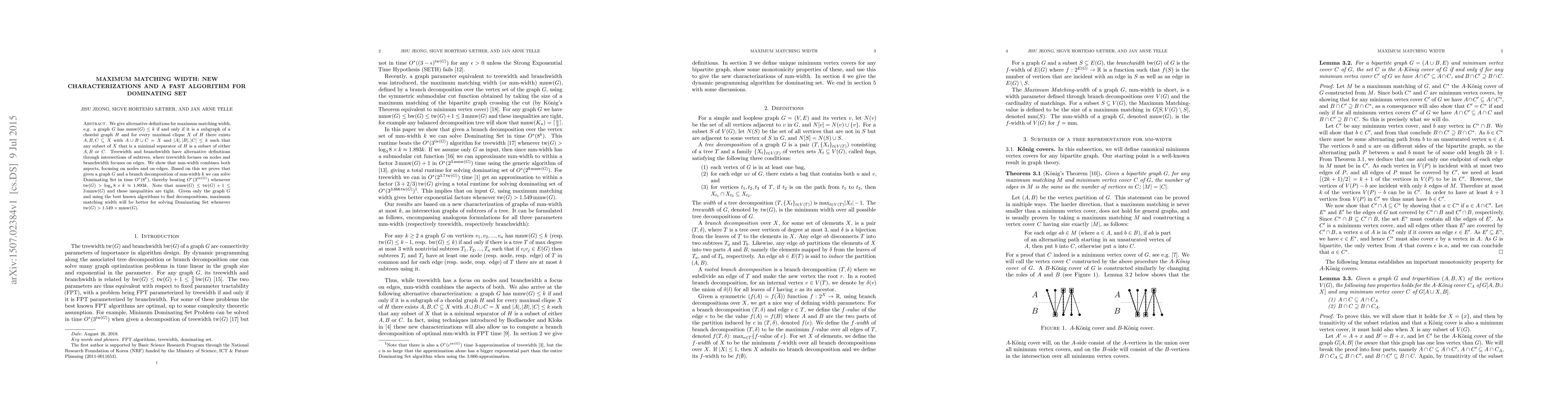 We give alternative definitions for maximum matching width, e.g. a graph $G$ has $\operatorname{mmw}(G) \leq k$ if and only if it is a subgraph of a chordal graph $H$ and for every maximal clique $X$ of $H$ there exists $A,B,C \subseteq X$ with $A \cup B \cup C=X$ and $|A|,|B|,|C| \leq k$ such that any subset of $X$ that is a minimal separator of $H$ is a subset of either $A, B$ or $C$. Treewidth and branchwidth have alternative definitions through intersections of subtrees, where treewidth focuses on nodes and branchwidth focuses on edges. We show that mm-width combines both aspects, focusing on nodes and on edges. Based on this we prove that given a graph $G$ and a branch decomposition of mm-width $k$ we can solve Dominating Set in time $O^*({8^k})$, thereby beating $O^*(3^{\operatorname{tw}(G)})$ whenever $\operatorname{tw}(G) > \log_3{8} \times k \approx 1.893 k$. Note that $\operatorname{mmw}(G) \leq \operatorname{tw}(G)+1 \leq 3 \operatorname{mmw}(G)$ and these inequalities are tight. Given only the graph $G$ and using the best known algorithms to find decompositions, maximum matching width will be better for solving Dominating Set whenever $\operatorname{tw}(G) > 1.549 \times \operatorname{mmw}(G)$.