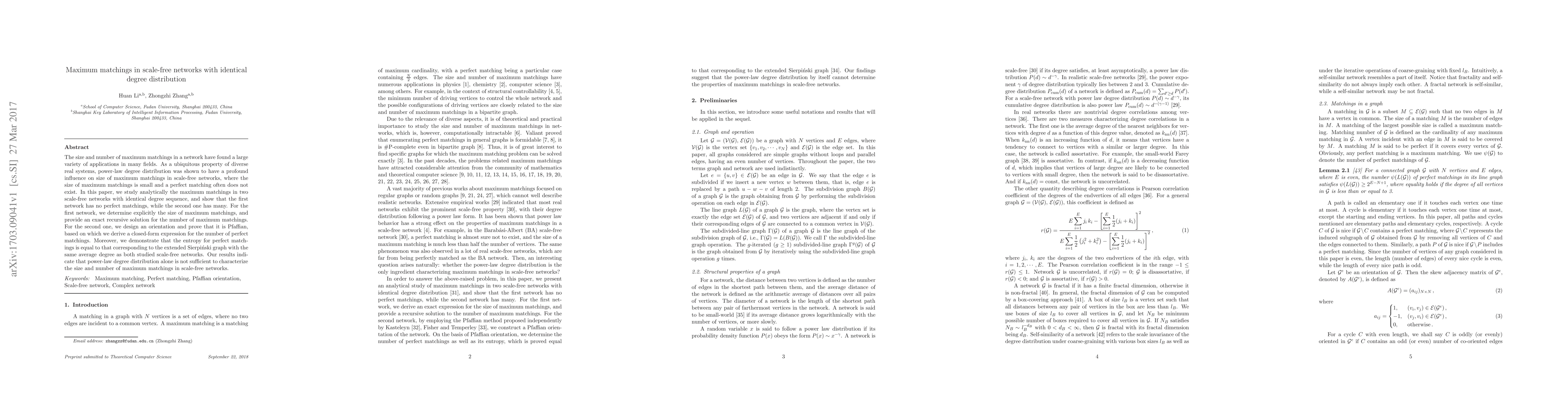 The size and number of maximum matchings in a network have found a large variety of applications in many fields. As a ubiquitous property of diverse real systems, power-law degree distribution was shown to have a profound influence on size of maximum matchings in scale-free networks, where the size of maximum matchings is small and a perfect matching often does not exist. In this paper, we study analytically the maximum matchings in two scale-free networks with identical degree sequence, and show that the first network has no perfect matchings, while the second one has many. For the first network, we determine explicitly the size of maximum matchings, and provide an exact recursive solution for the number of maximum matchings. For the second one, we design an orientation and prove that it is Pfaffian, based on which we derive a closed-form expression for the number of perfect matchings. Moreover, we demonstrate that the entropy for perfect matchings is equal to that corresponding to the extended Sierpi\'nski graph with the same average degree as both studied scale-free networks. Our results indicate that power-law degree distribution alone is not sufficient to characterize the size and number of maximum matchings in scale-free networks.