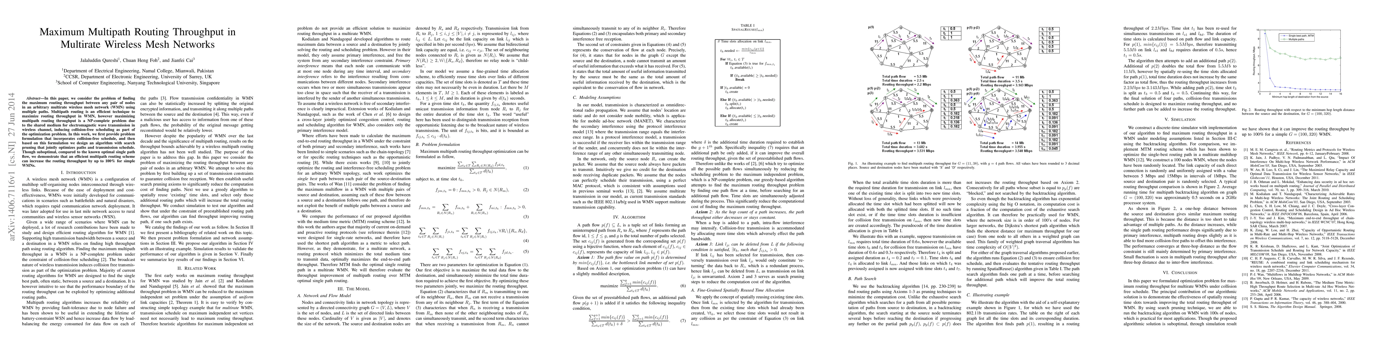 This paper addresses the NP-complete problem of maximizing multipath routing throughput in multirate wireless mesh networks, proposing an algorithm that optimizes both paths and collision-free scheduling to achieve up to a 100% increase in routing throughput compared to single path flow, though it is suboptimal. The algorithm employs search pruning to efficiently solve the complex optimization problem.