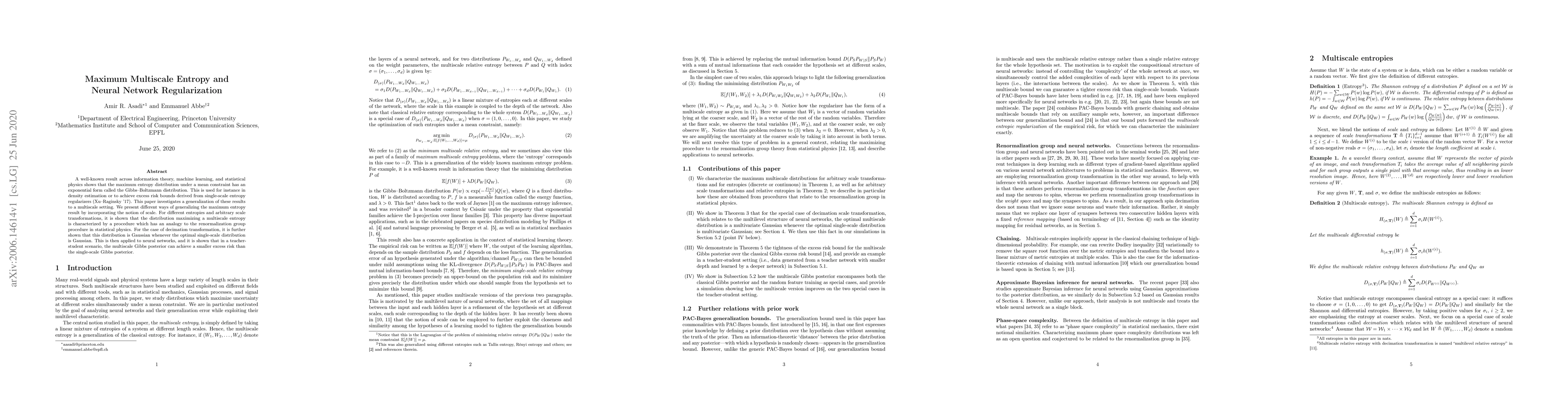 This paper explores a multiscale generalization of maximum entropy distributions, demonstrating that such distributions can be characterized by a renormalization group-like procedure. Applied to neural networks, the multiscale Gibbs posterior is shown to reduce excess risk compared to the single-scale version in a teacher-student learning scenario.