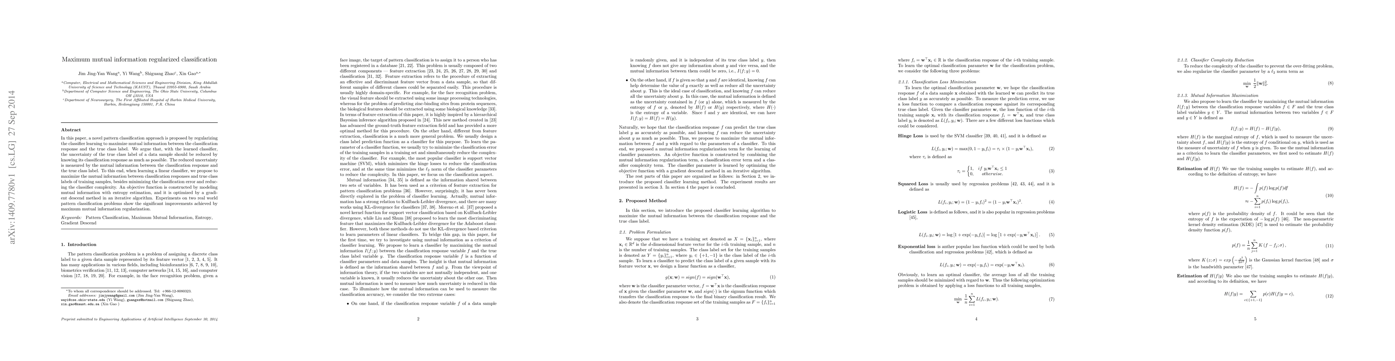This paper proposes a novel classification method that maximizes mutual information between classification responses and true class labels to reduce uncertainty. An objective function combining mutual information and classification error is optimized using gradient descent, demonstrating significant improvements in real-world pattern classification tasks.