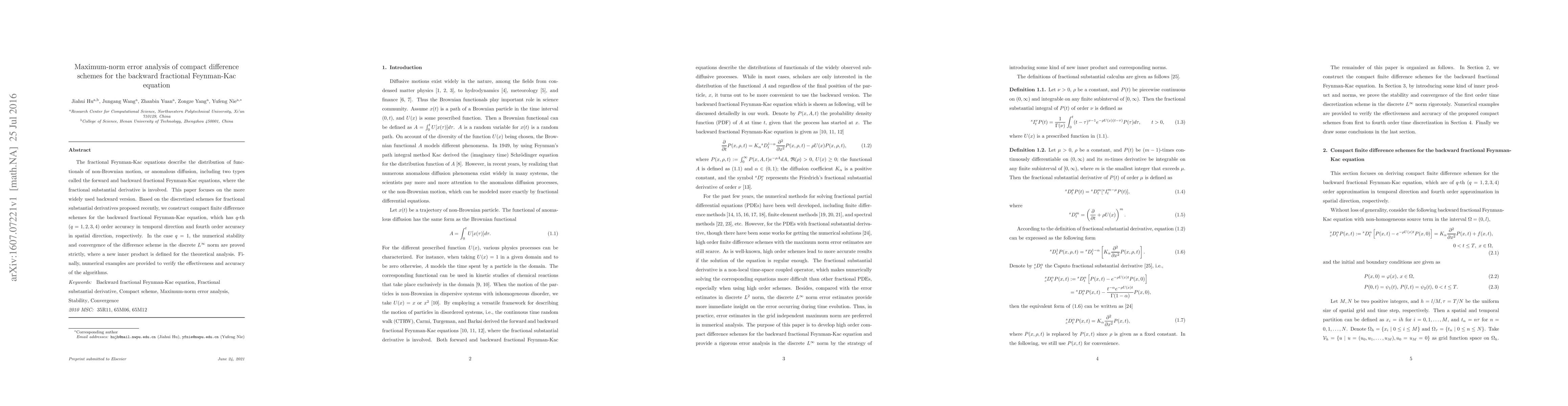 This paper develops compact finite difference schemes for the backward fractional Feynman-Kac equation, achieving high-order accuracy in temporal and spatial directions. It rigorously proves the stability and convergence of the scheme under q=1, and provides numerical examples to validate the method's effectiveness.
