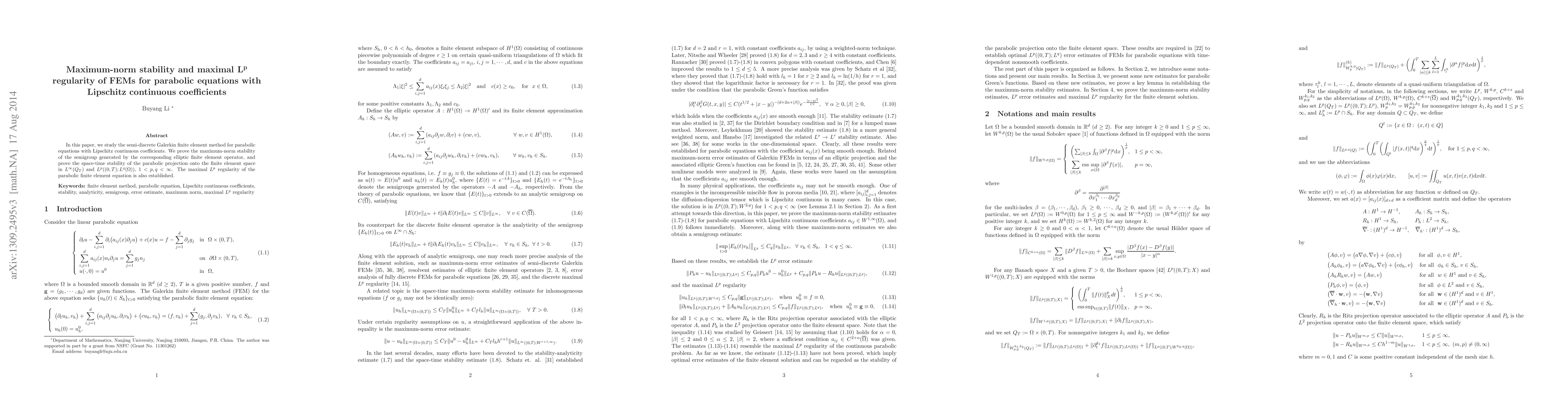 This paper investigates the semi-discrete Galerkin finite element method for parabolic equations with Lipschitz continuous coefficients, proving maximum-norm stability and maximal $L^p$ regularity. The results include space-time stability in $L^\infty$ and $L^p$ norms, alongside establishing maximal $L^p$ regularity for the parabolic finite element equation.