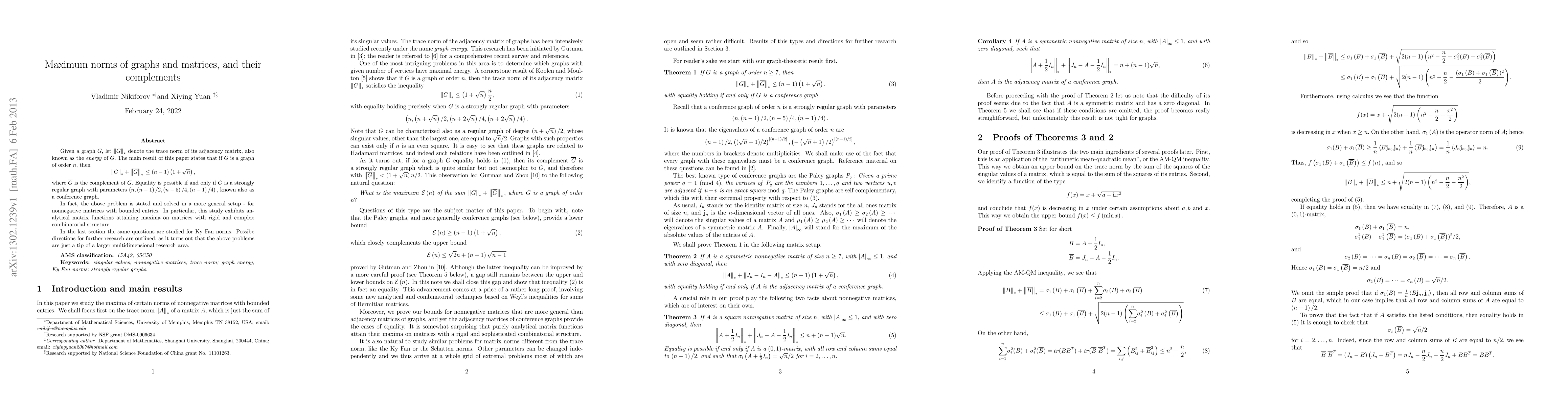 This paper investigates the trace norm of a graph's adjacency matrix, known as its energy, determining maximum values for both the graph and its complement. It extends these findings to nonnegative matrices with bounded entries and explores Ky Fan norms, highlighting potential avenues for future research in multidimensional matrix theory.