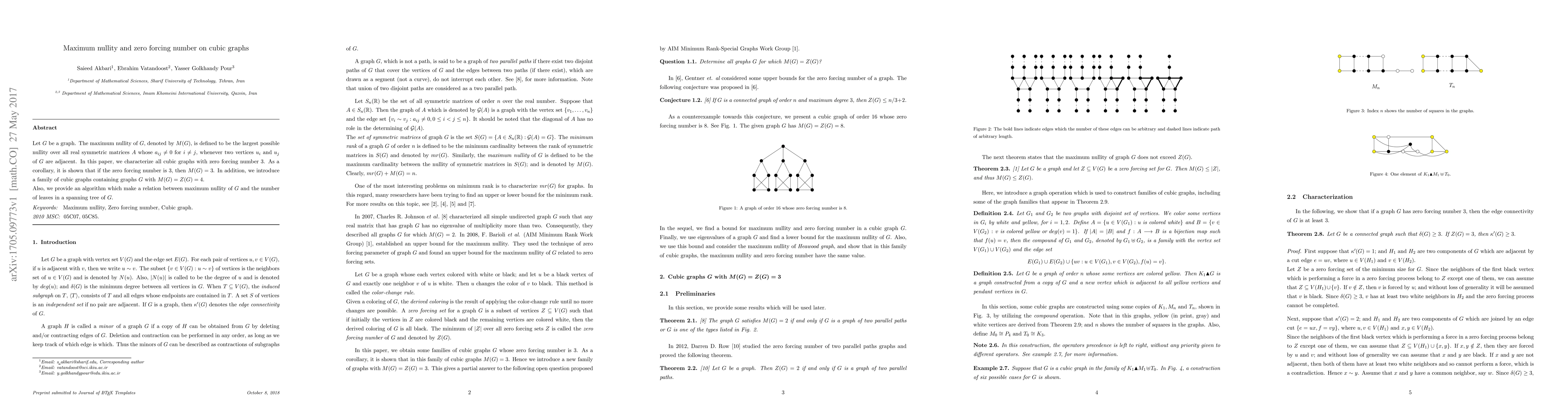 Let $G$ be a graph. The maximum nullity of $G$, denoted by $M(G)$, is defined to be the largest possible nullity over all real symmetric matrices $A$ whose $a_{ij}\neq 0$ for $i\neq j$, whenever two vertices $u_i$ and $u_j$ of $G$ are adjacent. In this paper, we characterize all cubic graphs with zero forcing number $3$. As a corollary, it is shown that if the zero forcing number is $3$, then $M(G)=3$. In addition, we introduce a family of cubic graphs containing graphs $G$ with $M(G)=Z(G)=4$. Also, we provide an algorithm which make a relation between maximum nullity of $G$ and the number of leaves in a spanning tree of $G$.