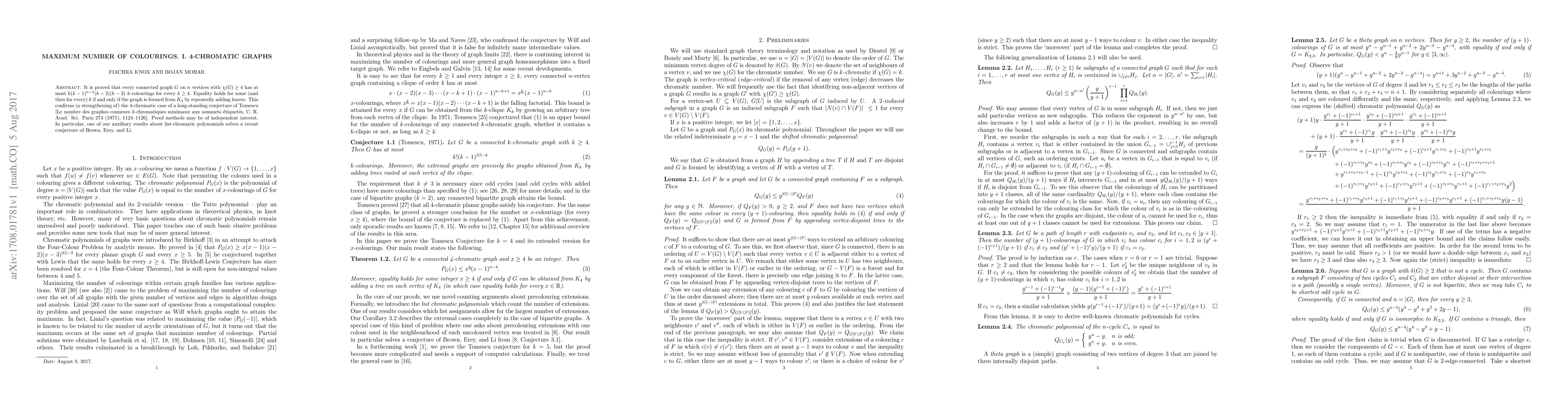 It is proved that every connected graph $G$ on $n$ vertices with $\chi(G) \geq 4$ has at most $k(k-1)^{n-3}(k-2)(k-3)$ $k$-colourings for every $k \geq 4$. Equality holds for some (and then for every) $k$ if and only if the graph is formed from $K_4$ by repeatedly adding leaves. This confirms (a strengthening of) the $4$-chromatic case of a long-standing conjecture of Tomescu [Le nombre des graphes connexes $k$-chromatiques minimaux aux sommets etiquetes, C. R. Acad. Sci. Paris 273 (1971), 1124-1126]. Proof methods may be of independent interest. In particular, one of our auxiliary results about list-chromatic polynomials solves a recent conjecture of Brown, Erey, and Li.