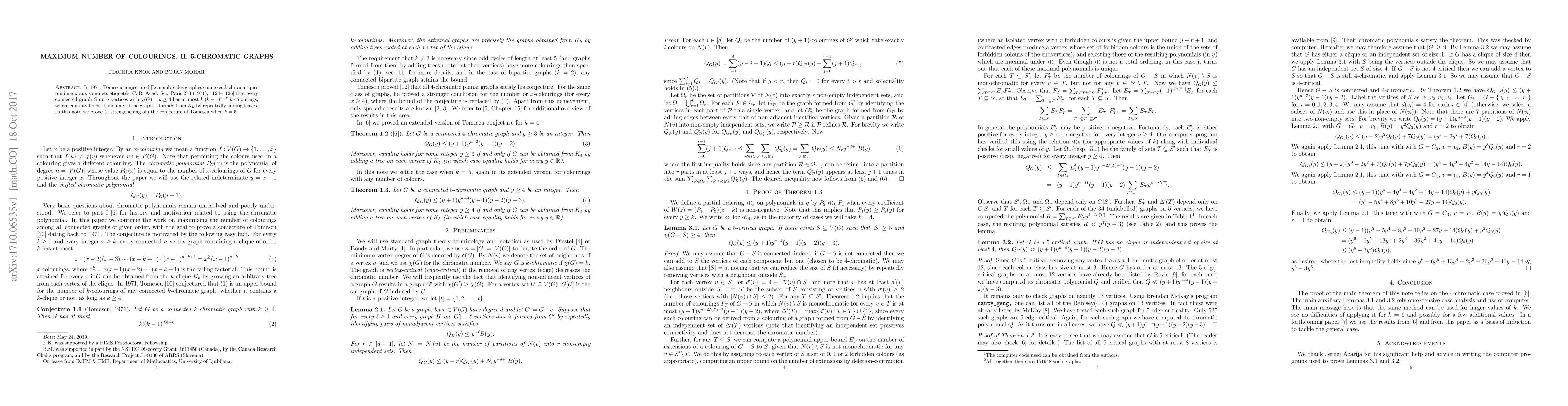 Researchers prove a strengthening of Tomescu's 1971 conjecture on graph coloring, showing that graphs with 5 colors have at most $120$ different possible colorings when formed from complete graphs by adding leaves.