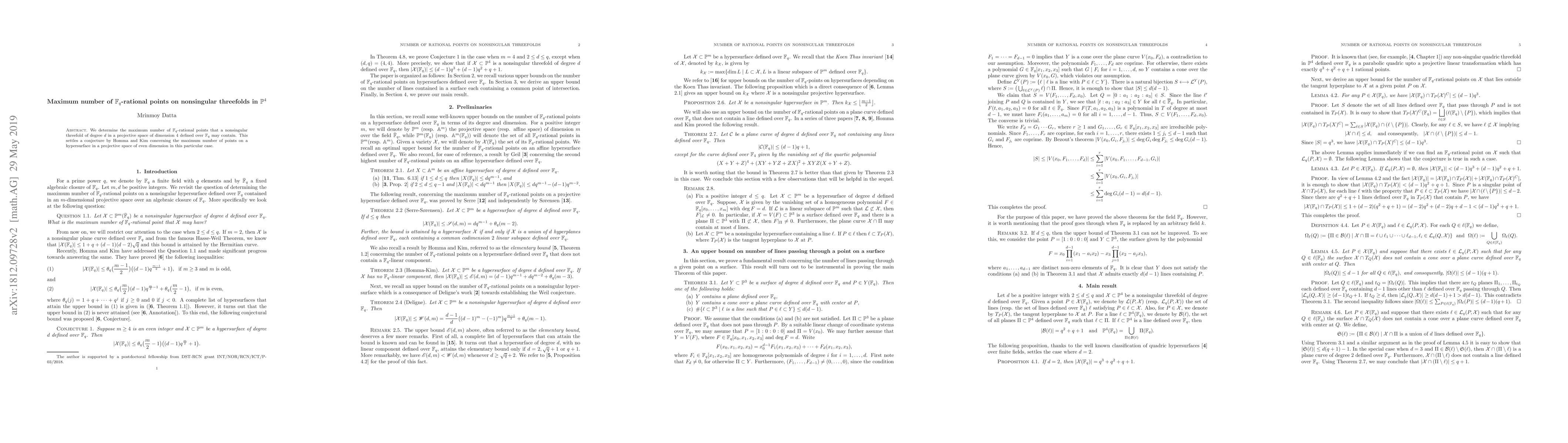 This paper determines the maximum number of $\mathbb{F}_q$-rational points on nonsingular threefolds of degree $d$ in $\mathbb{P}^4$ over $\mathbb{F}_q$, settling a conjecture by Homma and Kim regarding hypersurfaces in even-dimensional projective spaces.