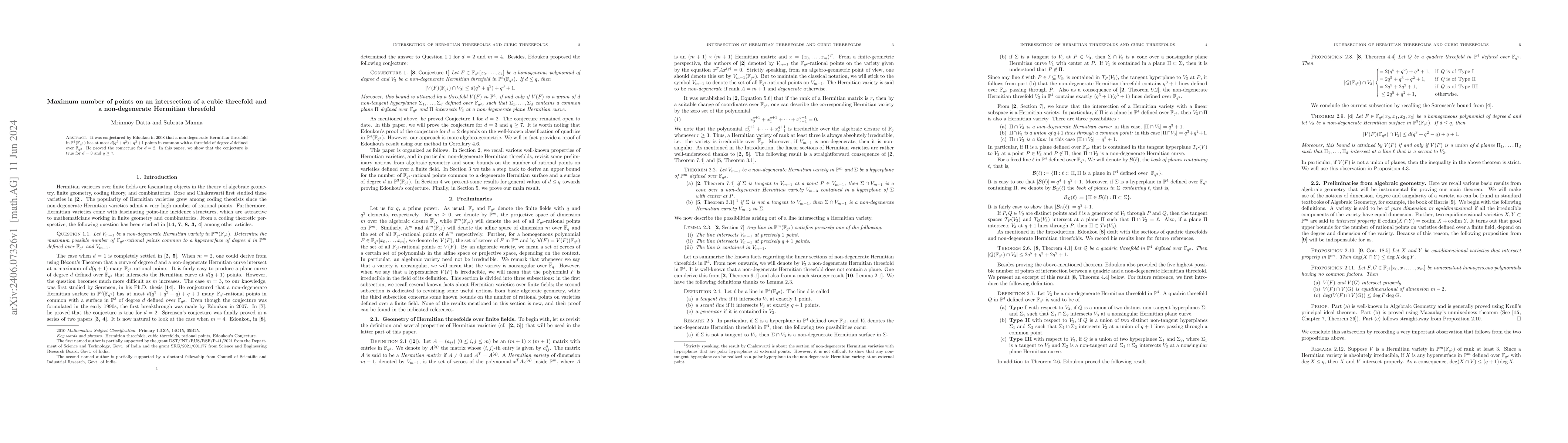 This paper proves Edoukou's 2008 conjecture for cubic threefolds in $\mathbb{P}^4 (\mathbb{F}_{q^2})$ intersecting a non-degenerate Hermitian threefold, showing that the maximum number of intersection points is $d(q^5+q^2) + q^3 + 1$ for $d = 3$ and $q \ge 7$.
