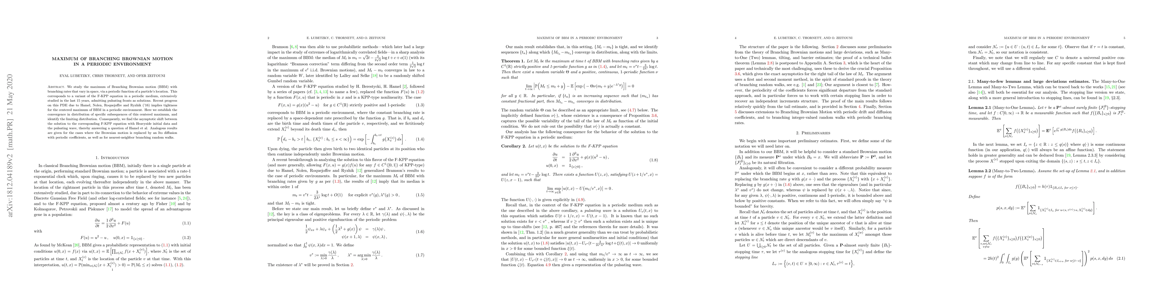This paper investigates the maximum of Branching Brownian motion in a spatially periodic environment, establishing convergence in distribution for specific subsequences of the centered maximum and identifying the limiting distribution. It also determines the asymptotic shift between the F-KPP equation solution and pulsating fronts, extending results to Ito diffusions and nearest-neighbor branching random walks.