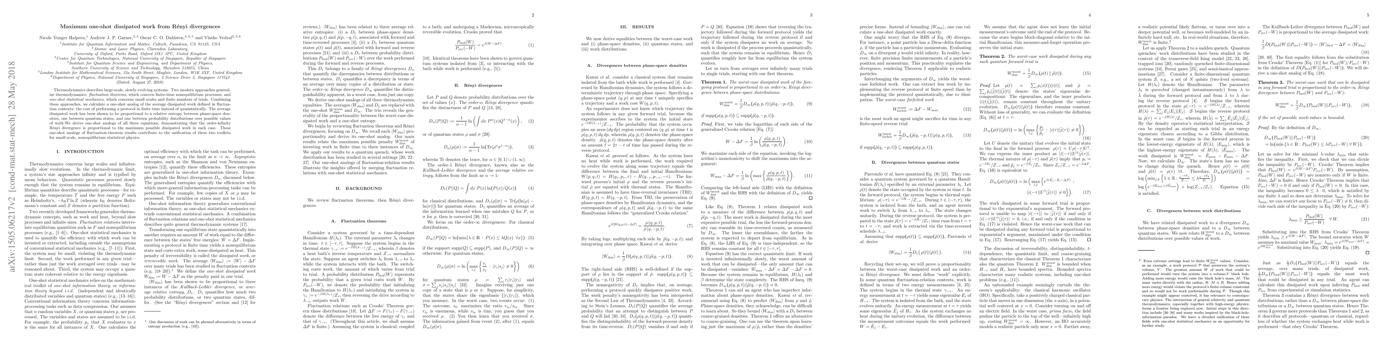 The paper presents one-shot analogs of relationships between average dissipated work and Renyi divergences, demonstrating that the maximum dissipated work is proportional to the order-infinity Renyi divergence in various contexts.