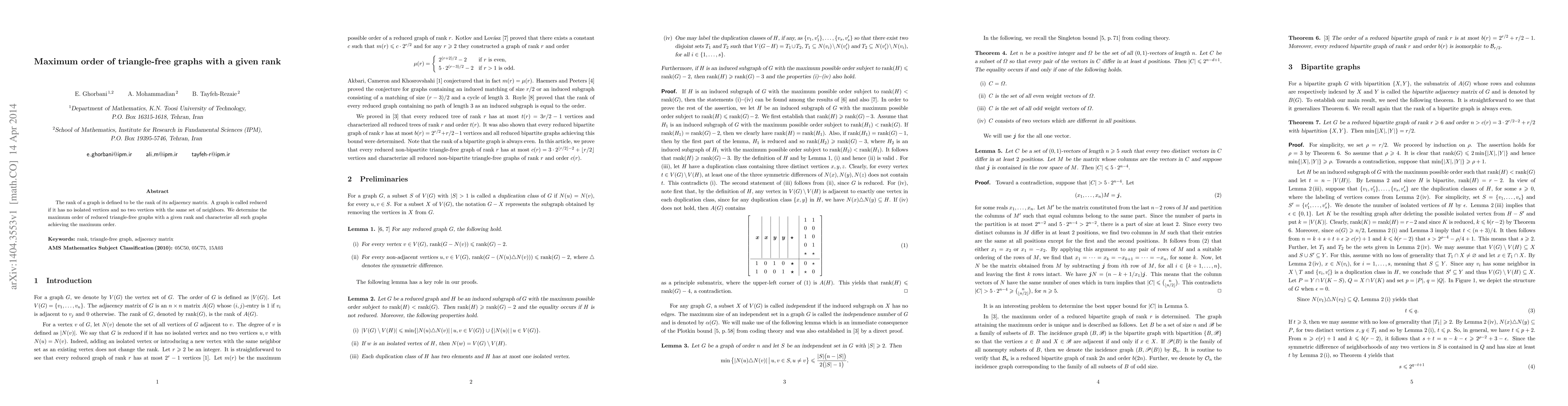 This paper determines the maximum number of vertices in reduced triangle-free graphs with a specified rank, and identifies all such graphs that achieve this maximum order. The rank of a graph is defined by the rank of its adjacency matrix.
