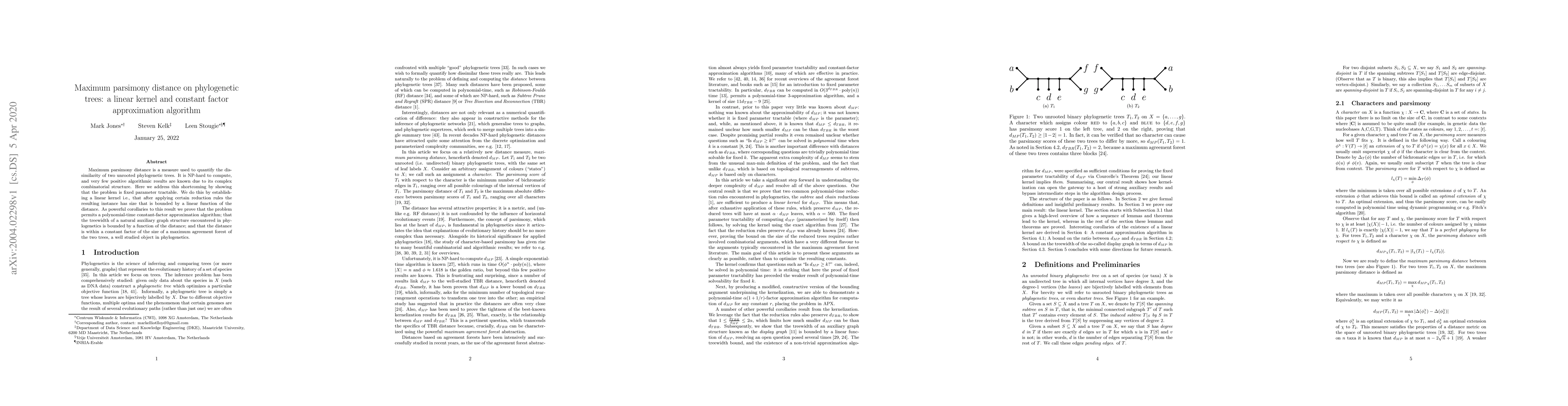 A research paper presents a solution to calculating maximum parsimony distance on phylogenetic trees using a linear kernel and constant factor approximation algorithm, making it fixed parameter tractable and enabling efficient computation.