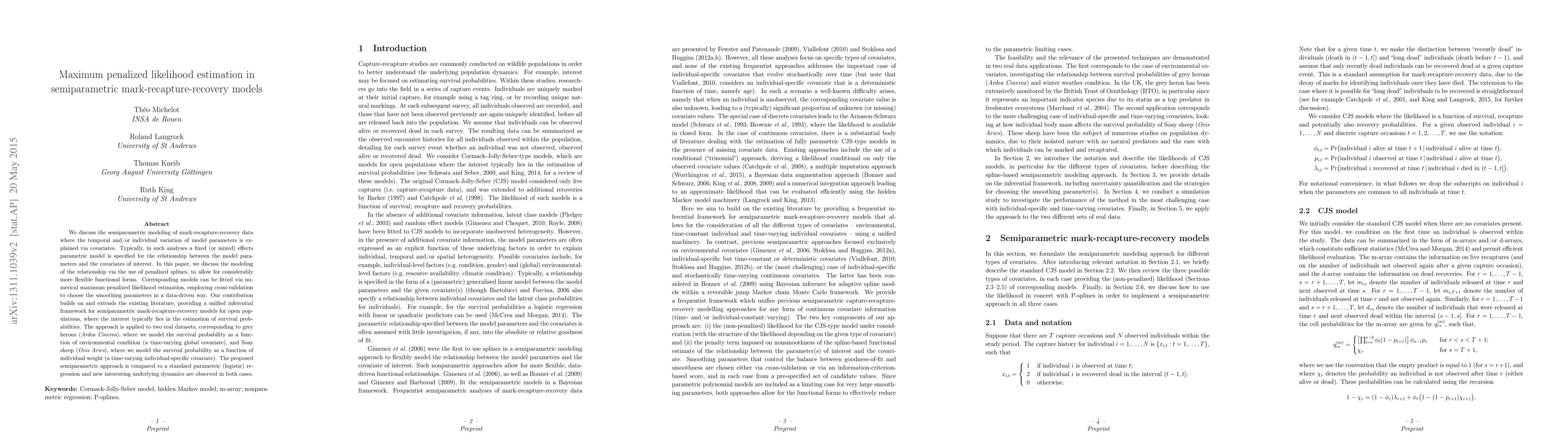 This paper proposes a semiparametric modeling approach using penalized likelihood estimation for capture-recapture data, employing flexible penalized splines to account for temporal and individual variations. The method is applied to datasets of grey herons and Soay sheep, revealing new dynamics in survival probability compared to standard parametric models.