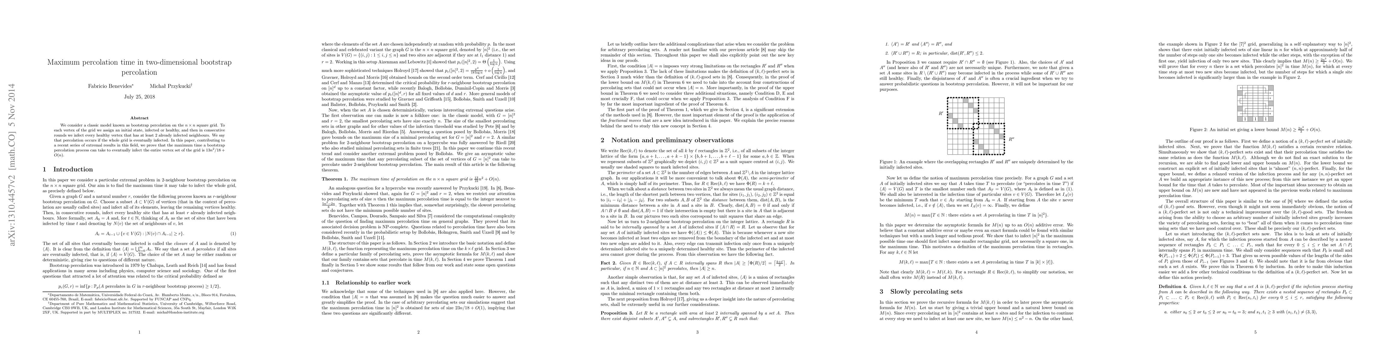 This paper investigates the maximum percolation time in two-dimensional bootstrap percolation on an $n \times n$ grid, proving that the entire grid can take up to $13n^2/18+O(n)$ rounds to become fully infected. This result contributes to recent extremal findings in the field.