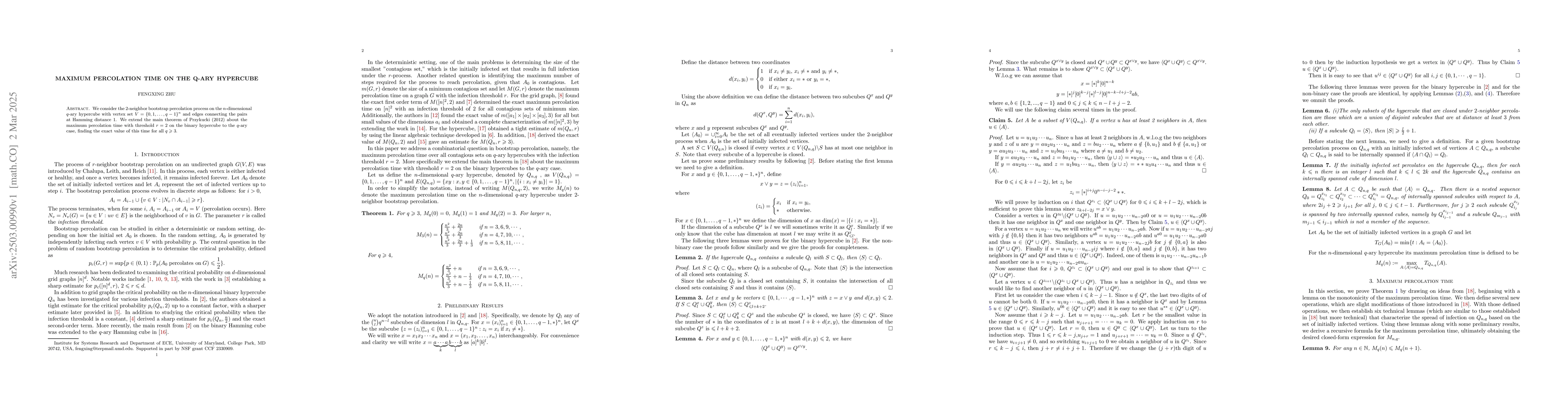 The paper presents an extension of Przykucki's (2012) theorem to the q-ary case, providing an exact value for maximum percolation time for all q ≥ 3.
