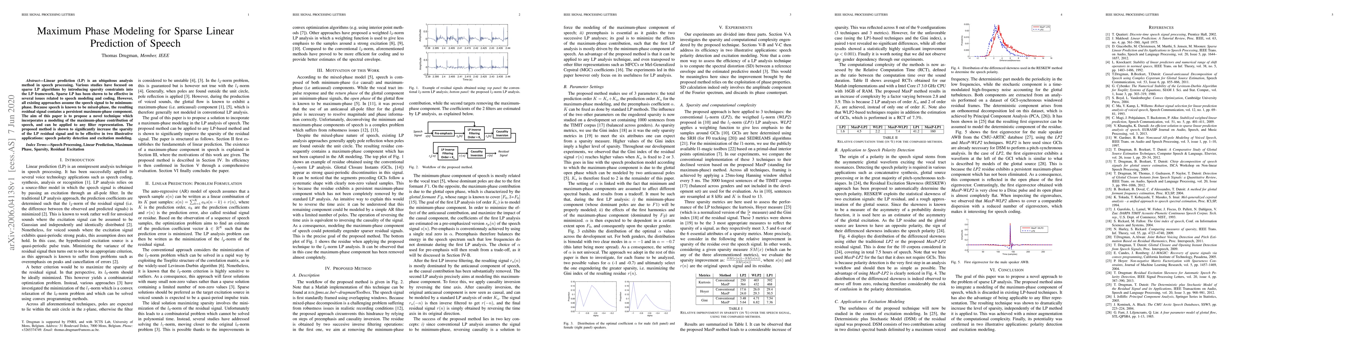 This paper proposes a novel technique for sparse linear prediction of speech that models the maximum-phase component, addressing the limitation of existing minimum-phase assumptions. The method is shown to enhance sparsity and is effective in applications like speech polarity detection and excitation modeling.