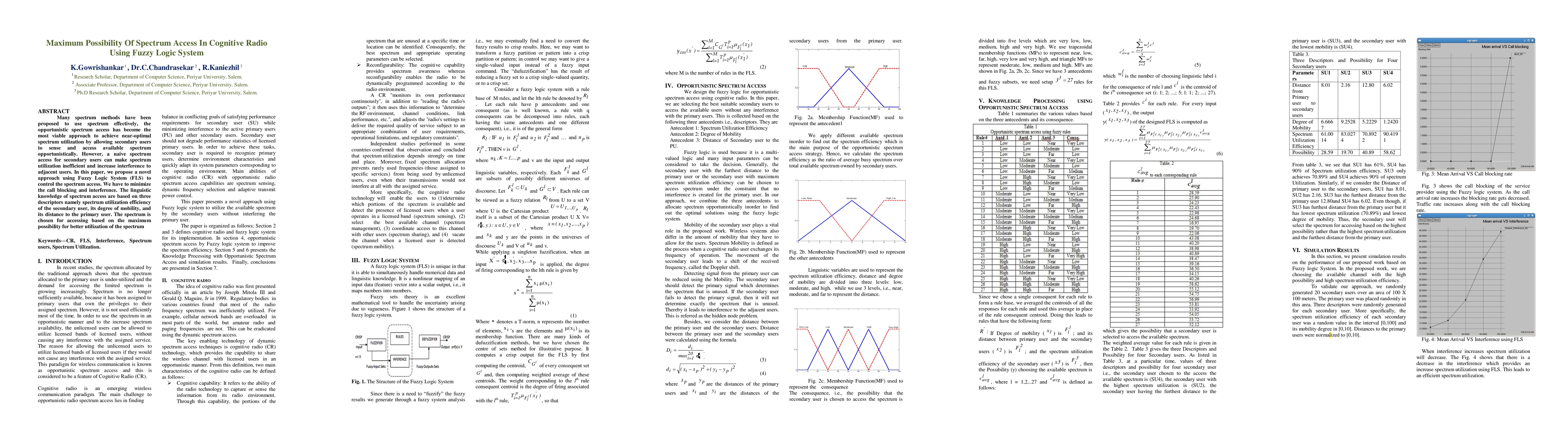This paper proposes a Fuzzy Logic System (FLS) to optimize spectrum access in cognitive radio networks, aiming to maximize spectrum utilization efficiency while minimizing call blocking and interference. The FLS uses linguistic knowledge based on secondary user's spectrum utilization efficiency, mobility, and proximity to primary users to determine the best spectrum for access.