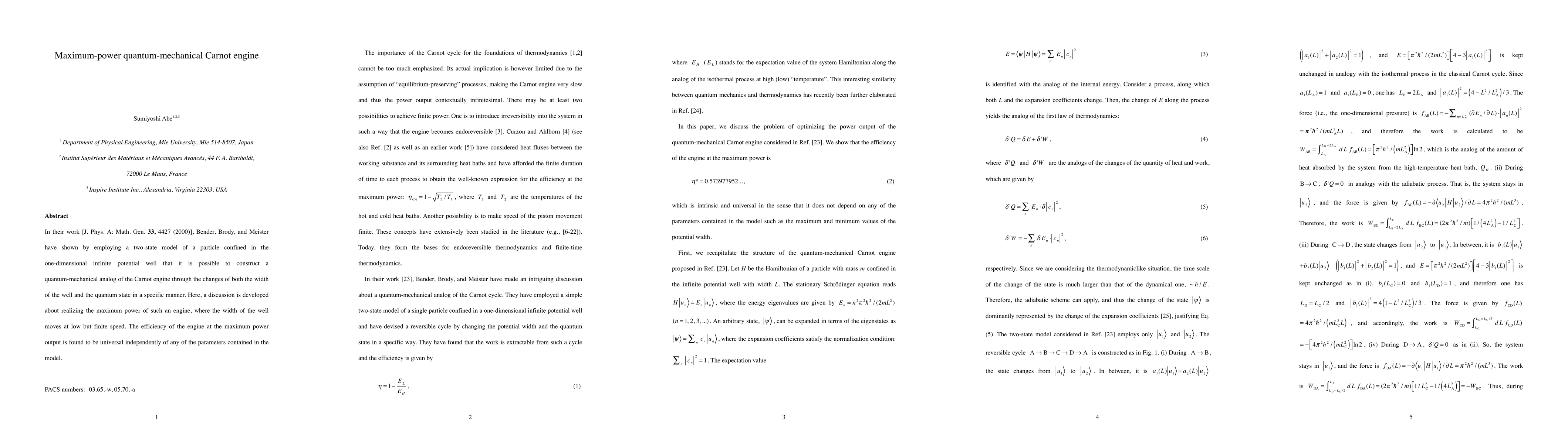 The paper presents a detailed analysis of the maximum power output of a quantum-mechanical Carnot engine, deriving expressions for work, efficiency, and power, and identifying conditions for maximum power and universal efficiency.
