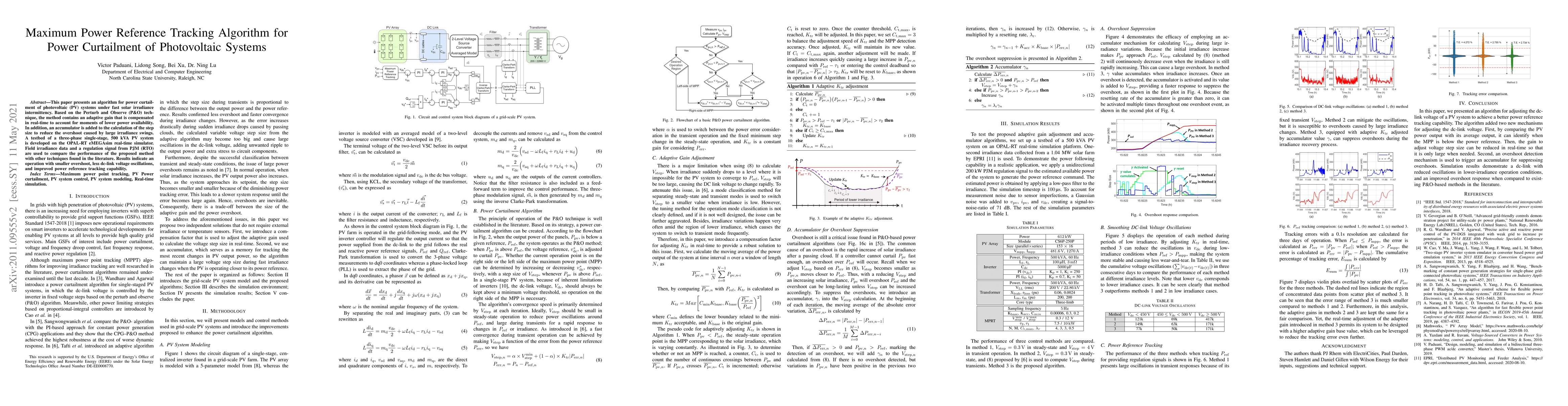 This paper introduces an adaptive Maximum Power Reference Tracking Algorithm for photovoltaic systems, utilizing an enhanced Perturb and Observe method with real-time gain compensation and an accumulator to reduce overshoot. Tests on a 500 kVA PV system simulator show improved performance with smaller overshoot and better power reference tracking.