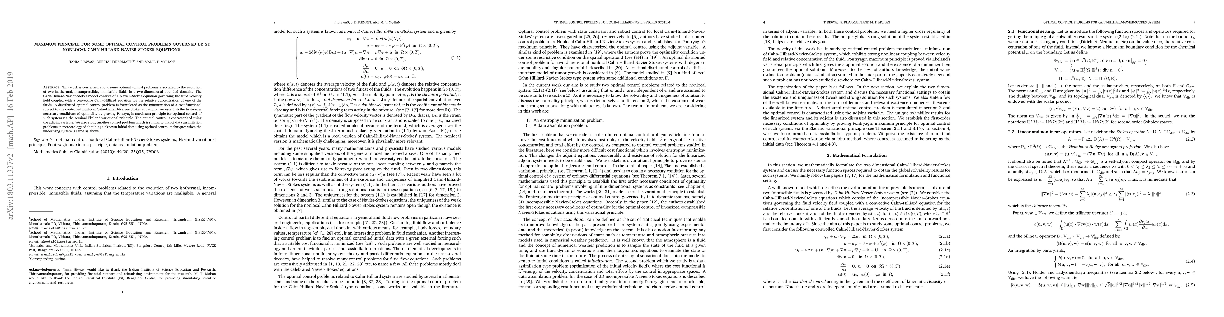 This paper formulates optimal control problems for a 2D nonlocal Cahn-Hilliard-Navier-Stokes system modeling fluid dynamics, proving the Pontryagin's maximum principle and characterizing the optimal control via adjoint variables. It also addresses a data assimilation problem to determine optimal initial conditions.